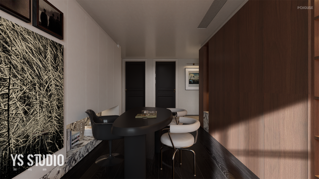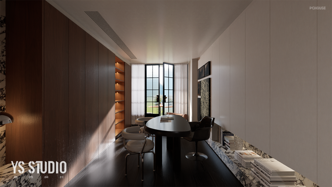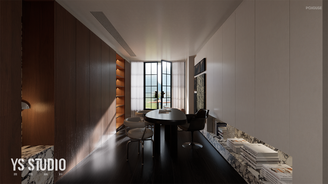 完整的审美体系赋予了全屋更为自洽和统一的材质运用,木材、大理石等材料的碰撞在书房延续,传递了自由的穿行。小阳台的随性也传达来自然主义的氛围感和静谧之美。