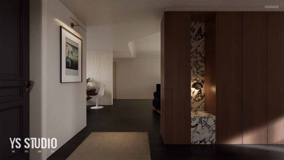 我们需要一个入户的空间,因此没有选择全开敞式的设计。以墙体的构造和圆弧转角相结合,又运用了不同材质,大理石、洞石、木材、白墙等碰撞,带来了优雅的气度和复古的基调。在有限的空间中,我们仍利用墙面闲散空隙设计了一个50公分深度的鞋柜,增加储物。