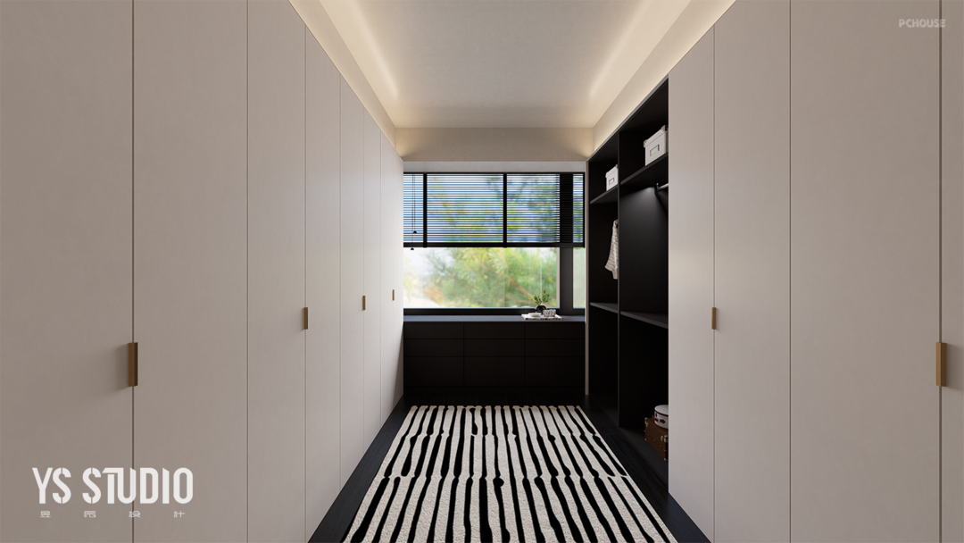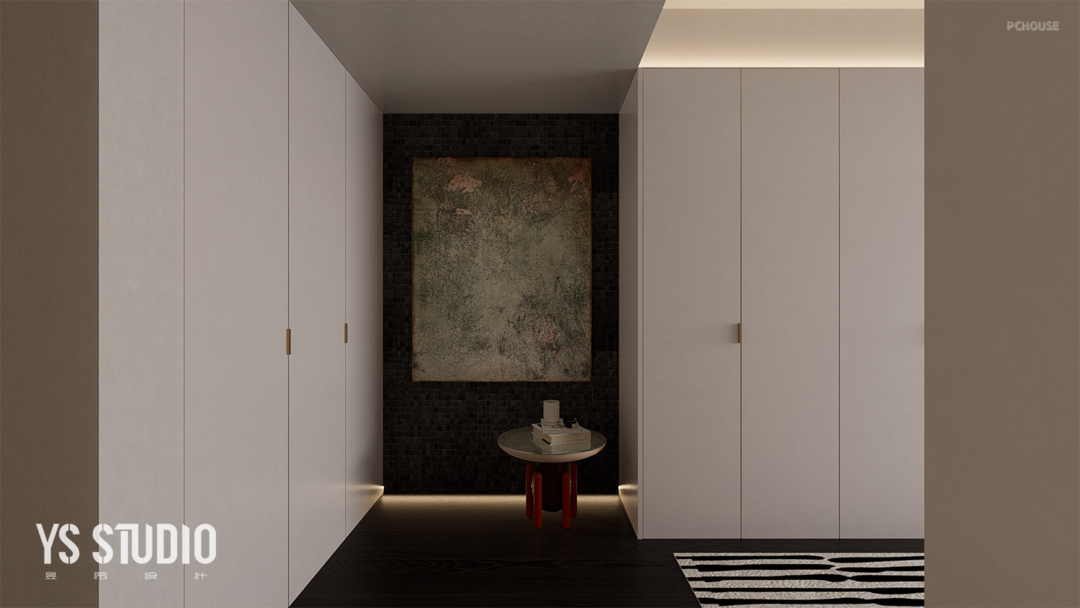 衣帽间黑白相间,呈现了自然简约。因为多年对时尚领域的侵染,屋住有非常多的收藏,于是更需要充足的收纳体系,既保证了日常的实用性,又在不经意的细节中打造了美丽的角落-将原版的版画再次运用到空间当中。