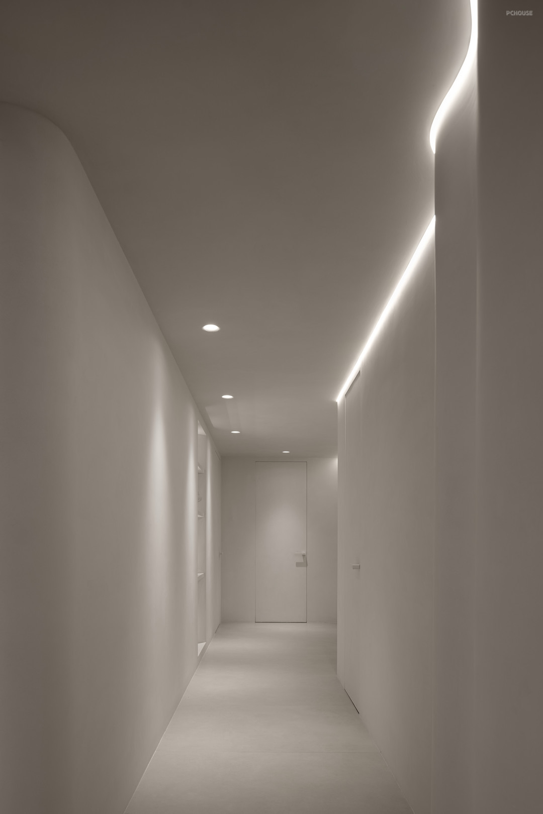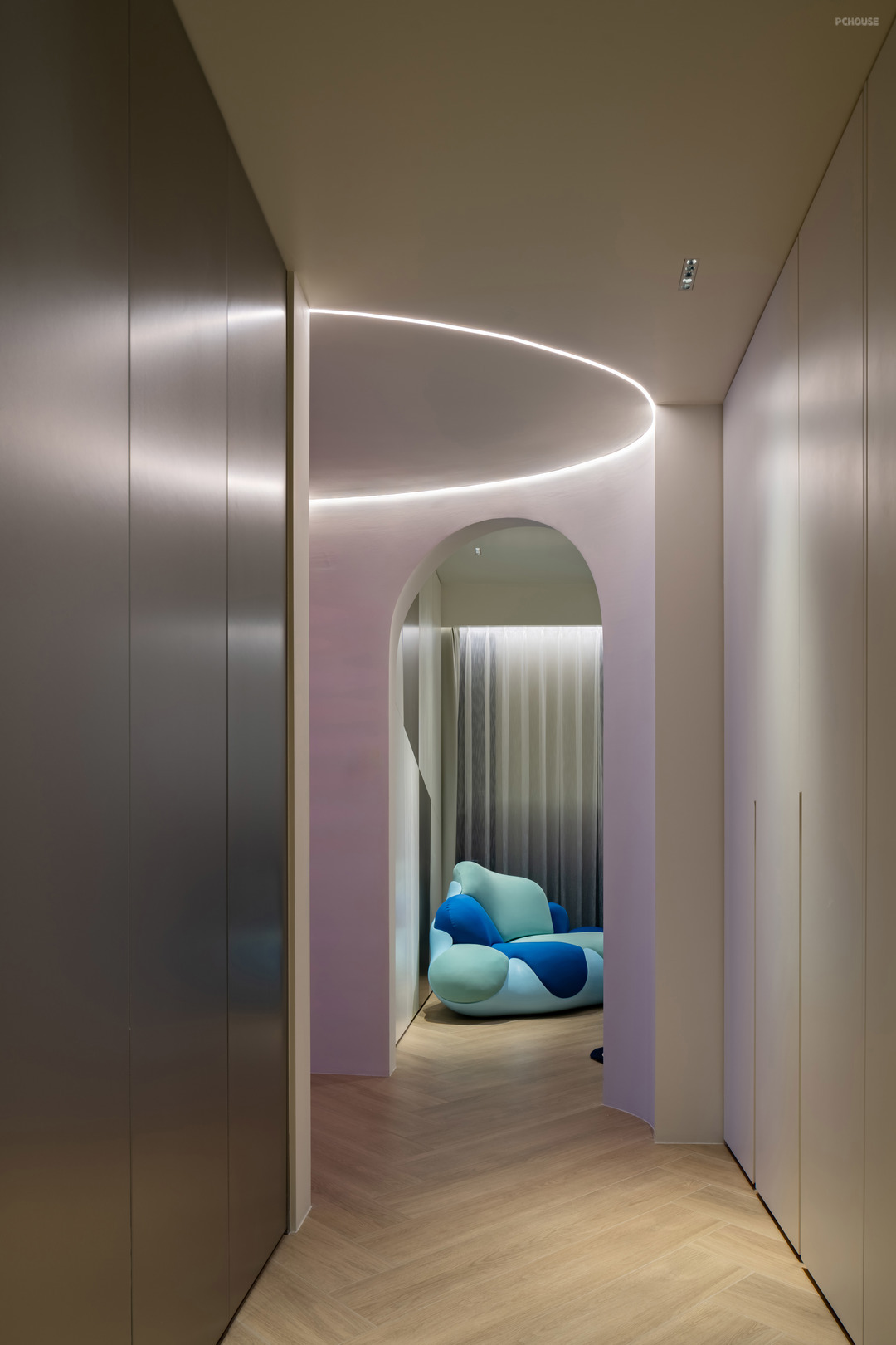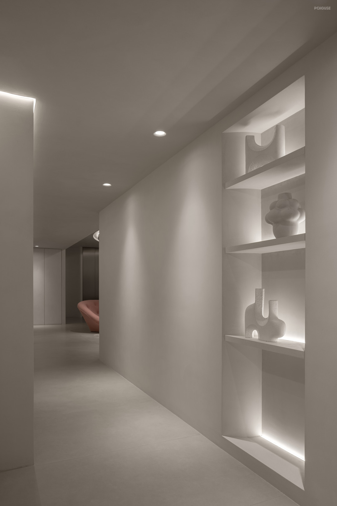 设计师将过道通过弧形处理,让原本狭窄的过道更加立体,弧形灯带则是给这雕塑般的造型增加更多的艺术美感。纯白摆件构设艺术意境,予人视觉上立体不落俗的体验。