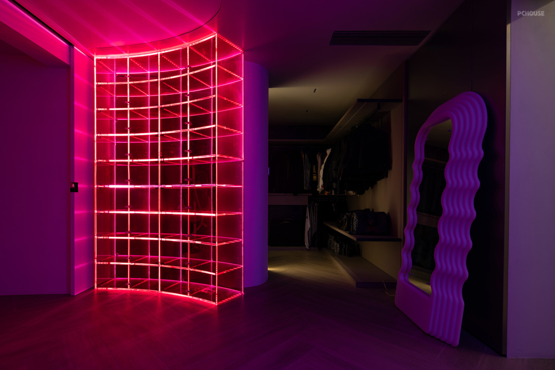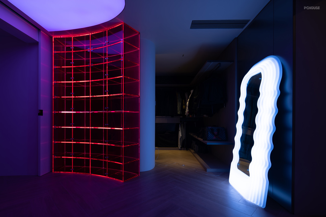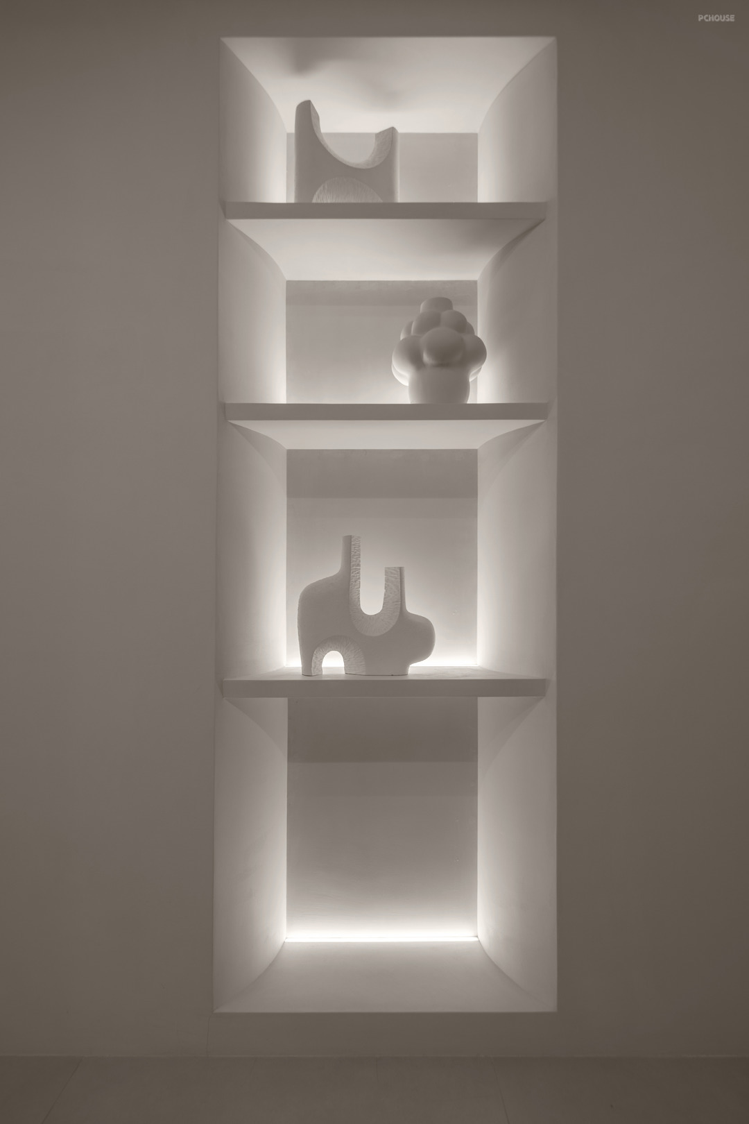 设计师将过道通过弧形处理,让原本狭窄的过道更加立体,弧形灯带则是给这雕塑般的造型增加更多的艺术美感。纯白摆件构设艺术意境,予人视觉上立体不落俗的体验。