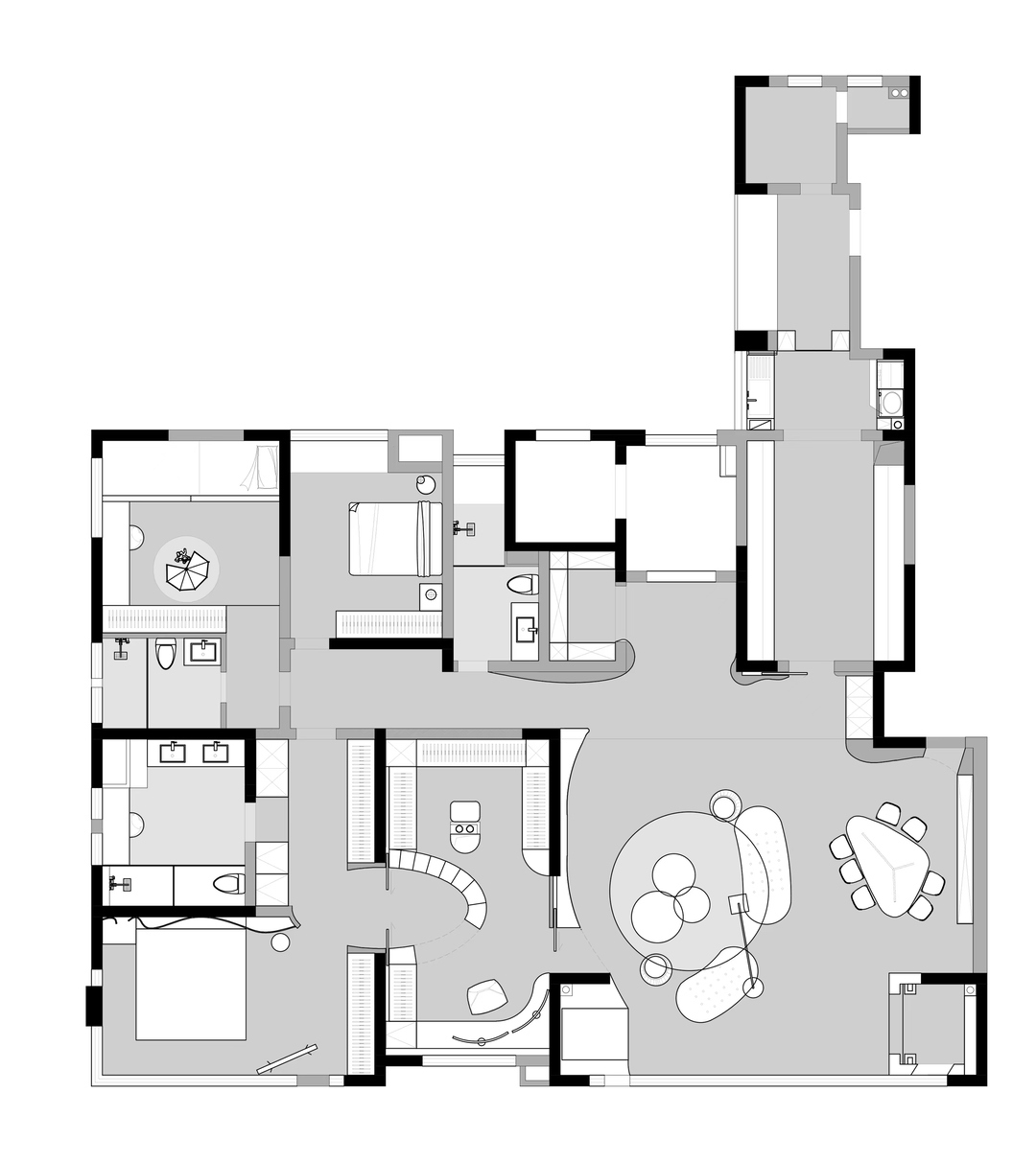 家具陈列从平面上解构,呈现不规则状态,以艺术品的方式摆放,轻盈而舒展自如。渐次融入光影、色调,反复雕琢,在柔和的配色与停顿中,间奏出空间的质感。