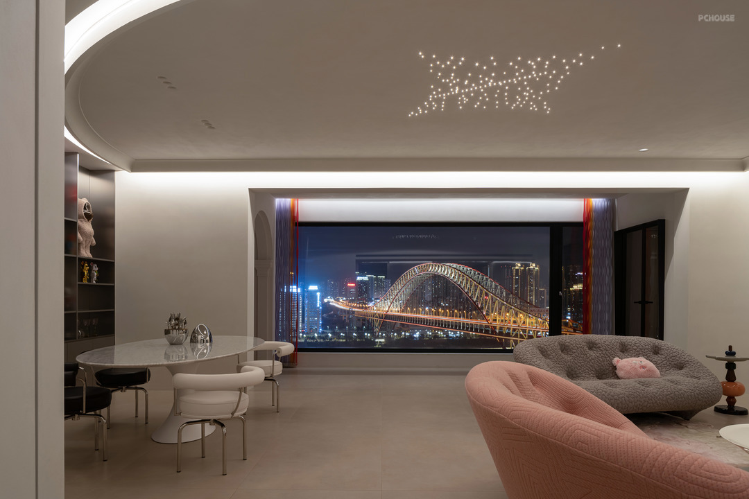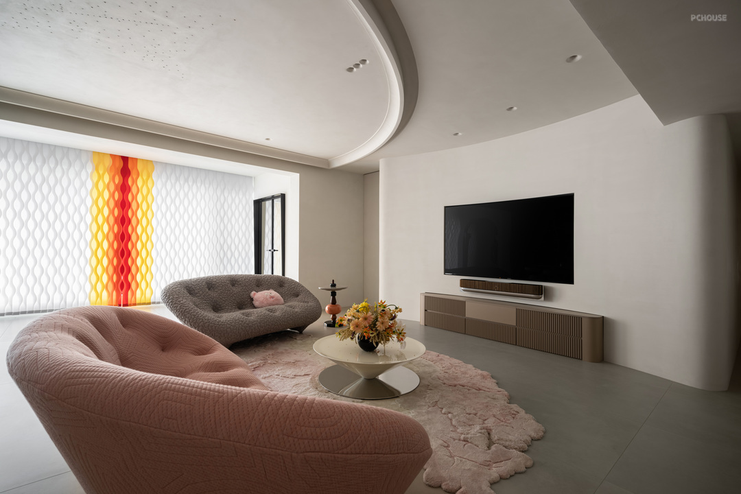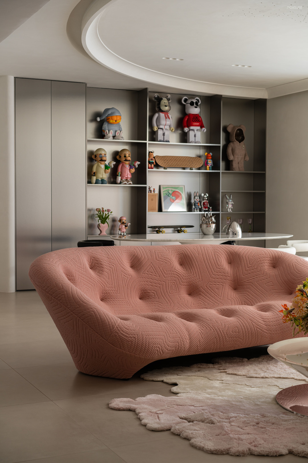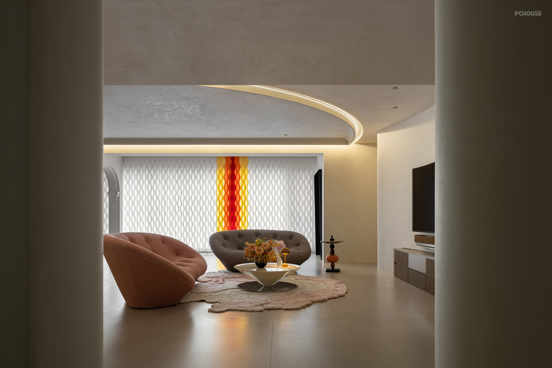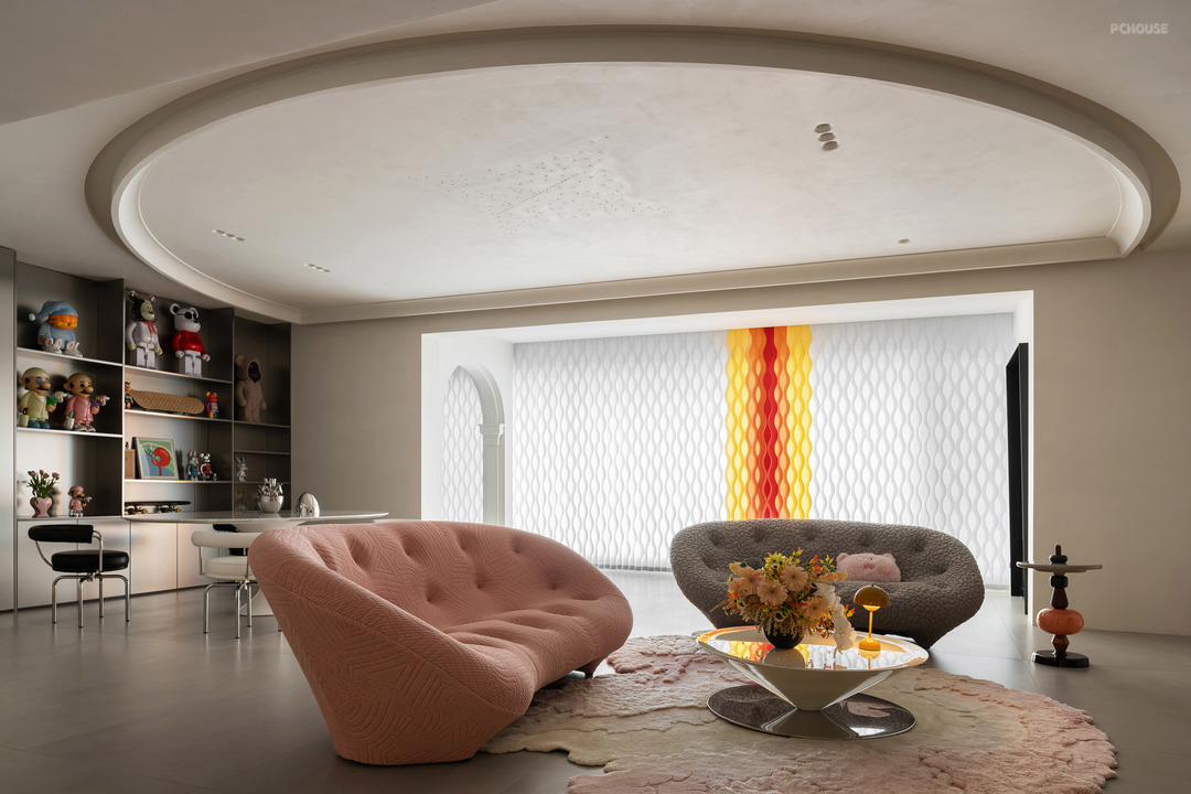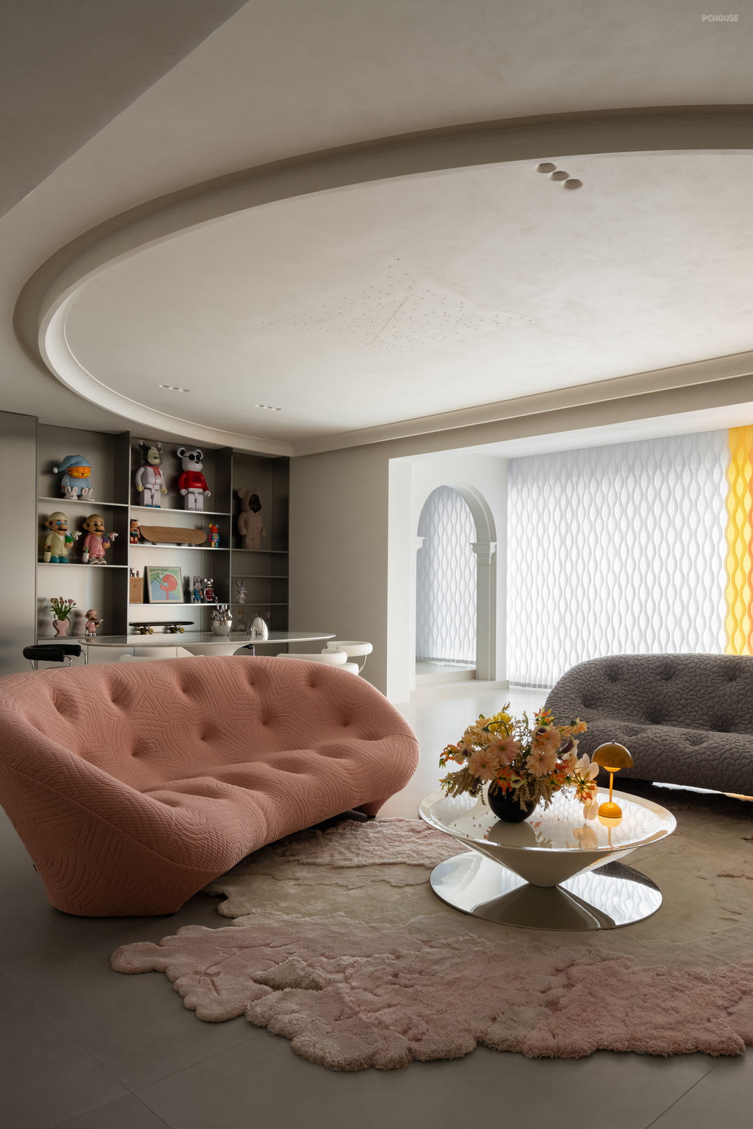 客厅仿若一个圆弧形的“剧场”,空间感、尺度感、软装布料、色彩搭配、照明设计等等氛围营造将灿烂情绪推向高潮,去张扬个性、艺术与独立的思想。