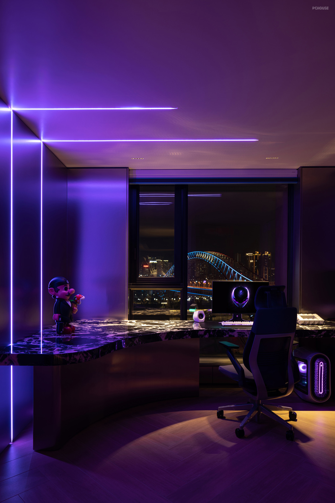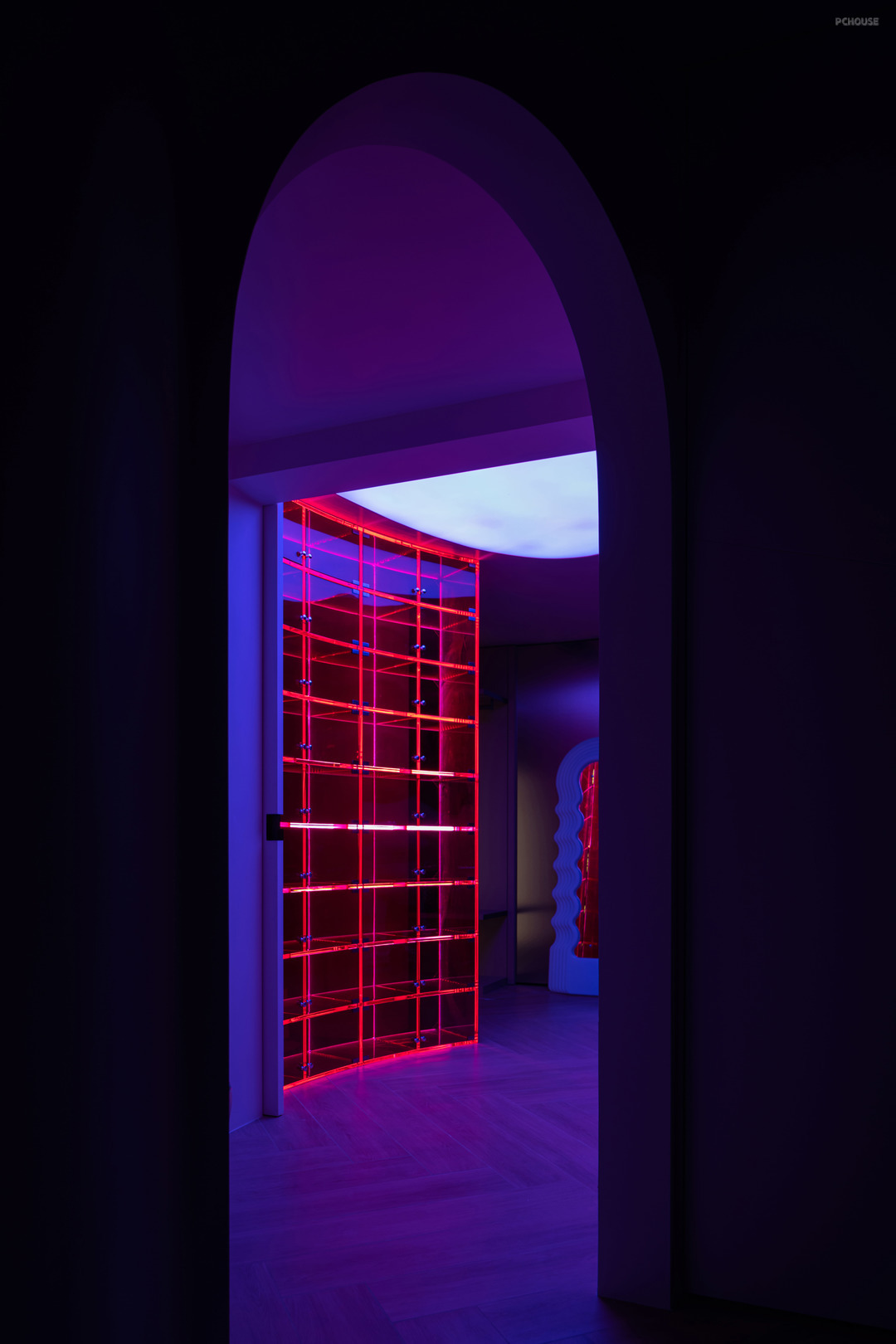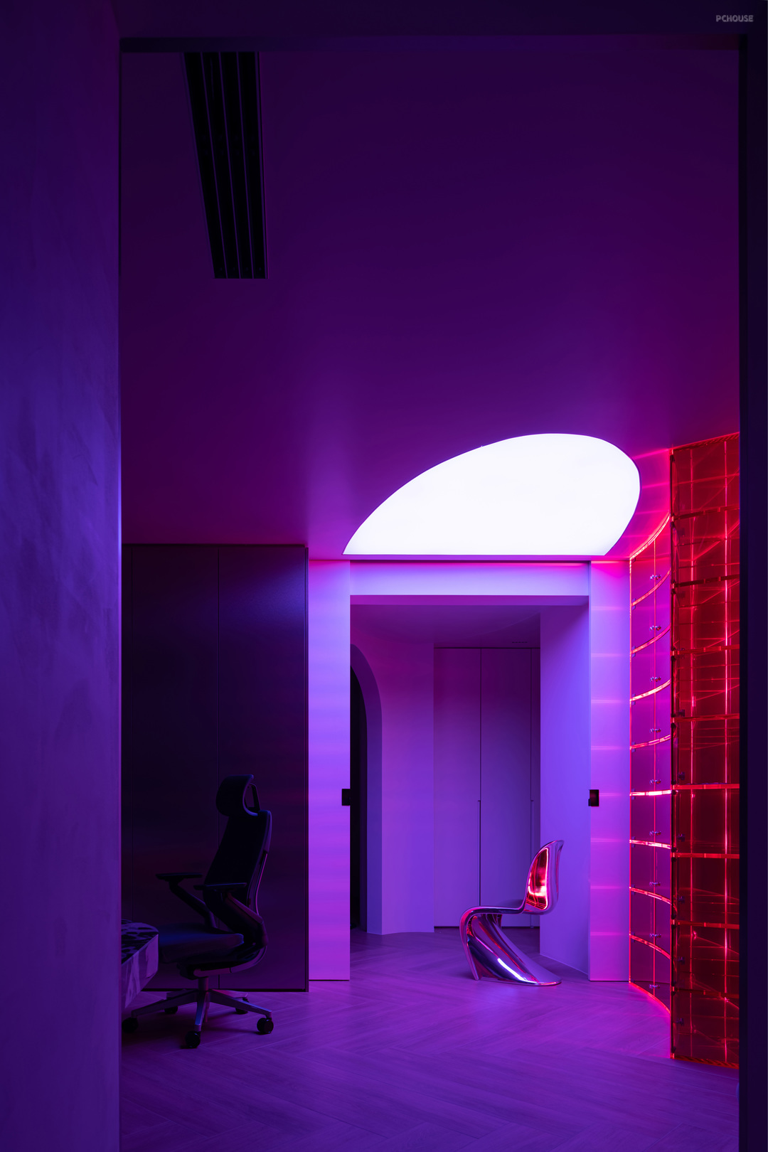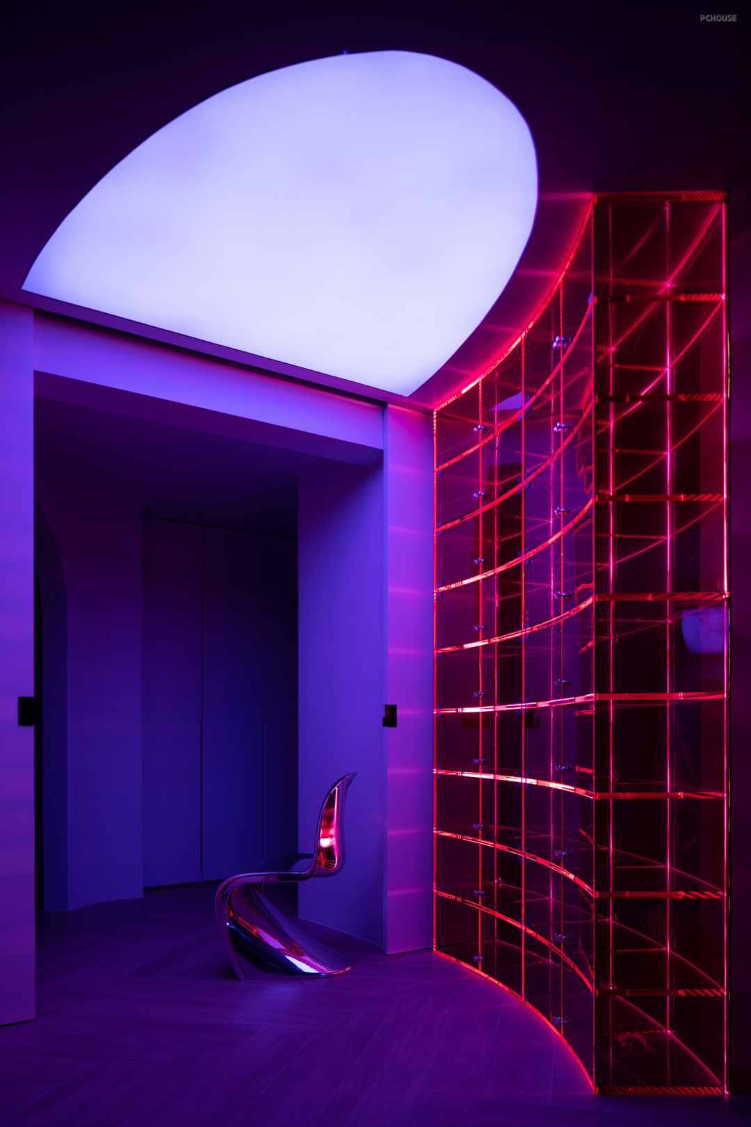 客厅仿若一个圆弧形的“剧场”,空间感、尺度感、软装布料、色彩搭配、照明设计等等氛围营造将灿烂情绪推向高潮,去张扬个性、艺术与独立的思想。