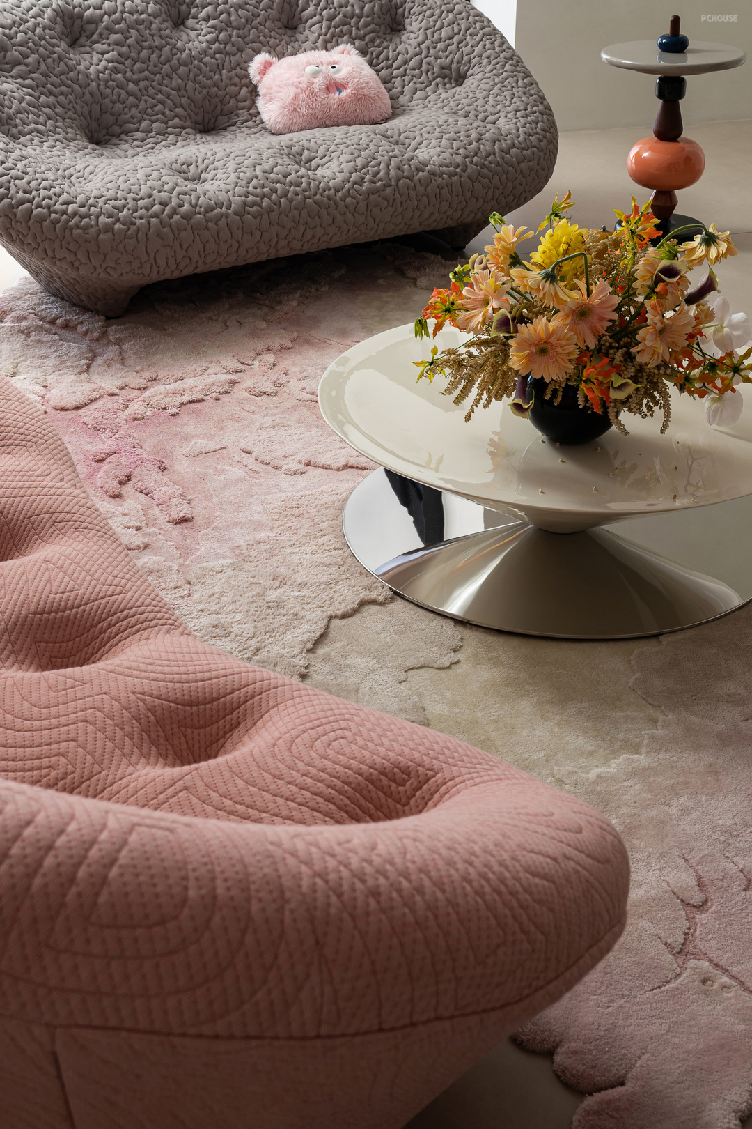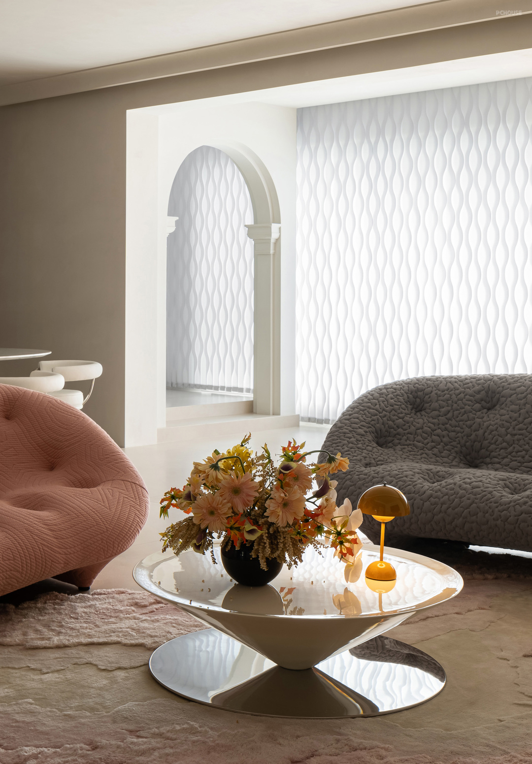 来自写意空间的Ploum贝壳沙发,有着浪漫的线条感,独特的“脑花纹”如同波澜起伏的雕塑一般,搭配异形地毯,塑造出由内而外的现代艺术感。