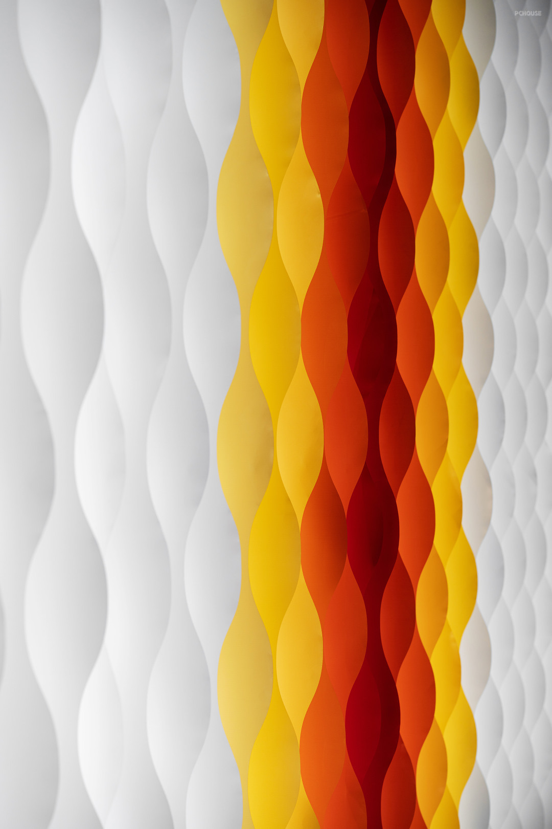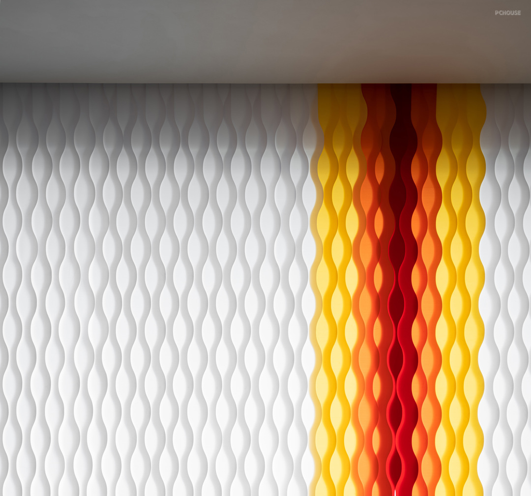 Silent Gliss 打造的梦幻垂直波纹帘,色彩绚烂而明亮。在激光打印、3D切割技术的加持下,在阳光与阴影的相互交织中,这已不仅仅是单纯的窗帘设计,更像是一幅艺术画作。