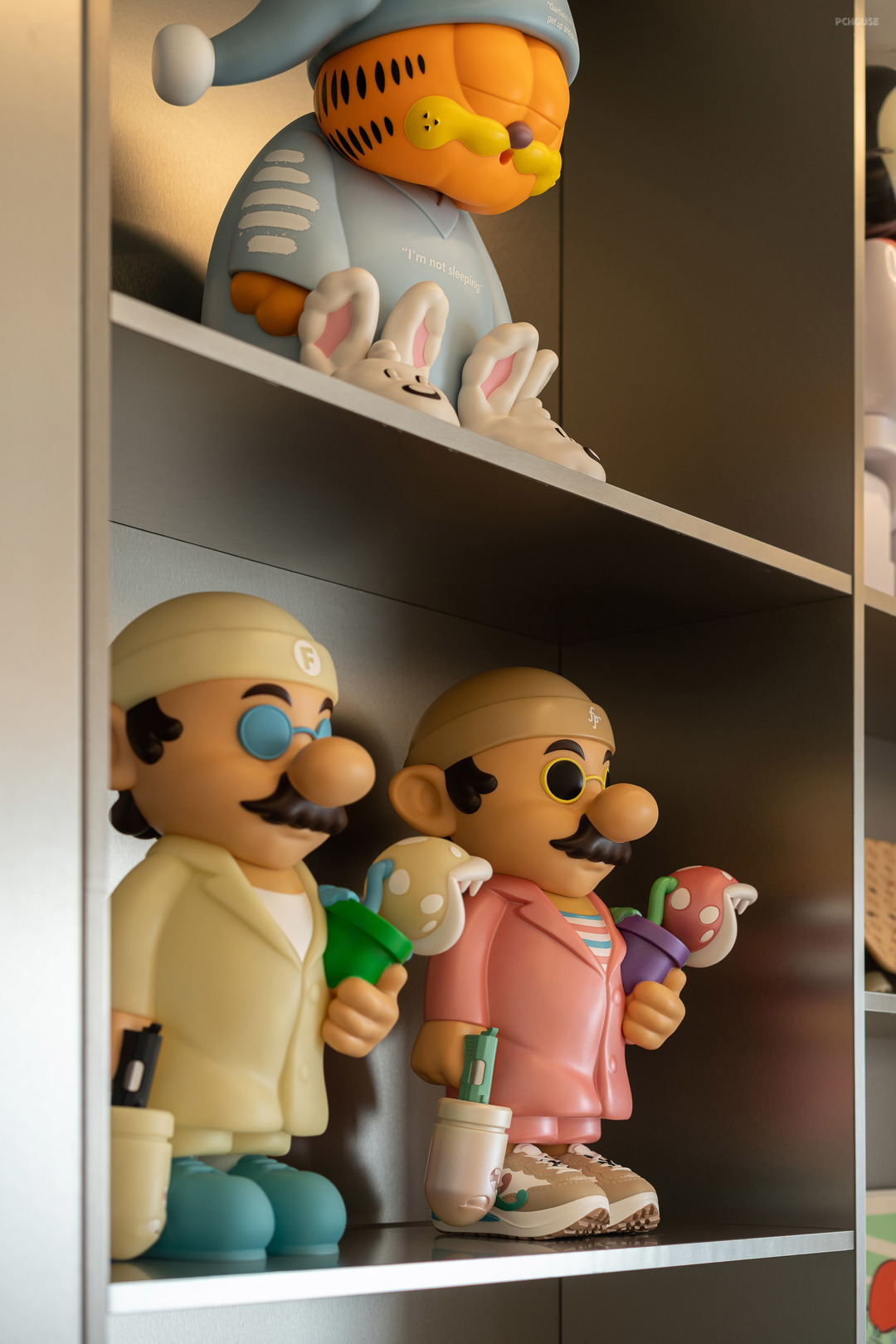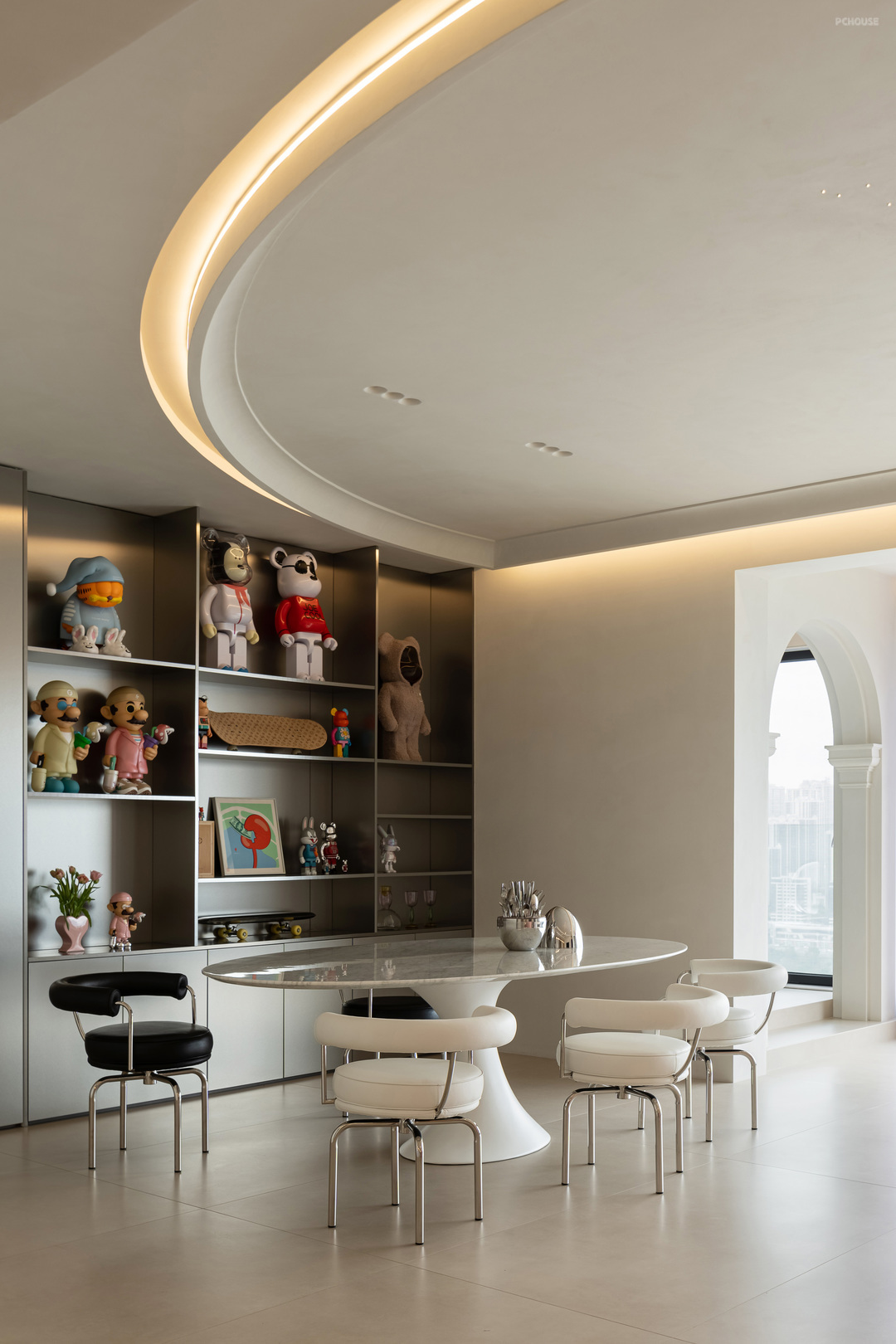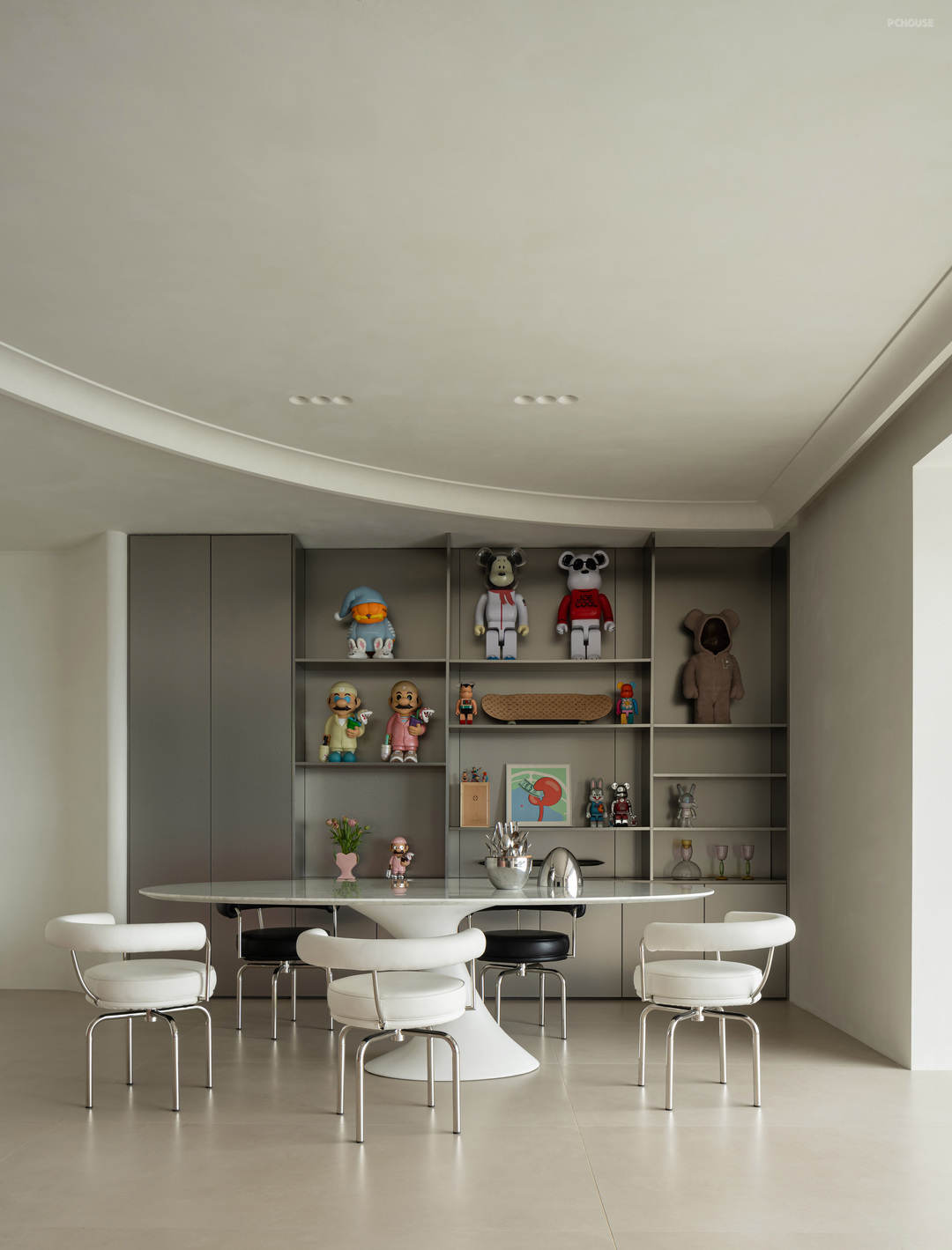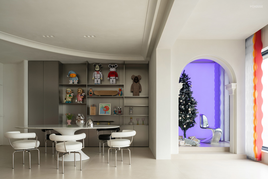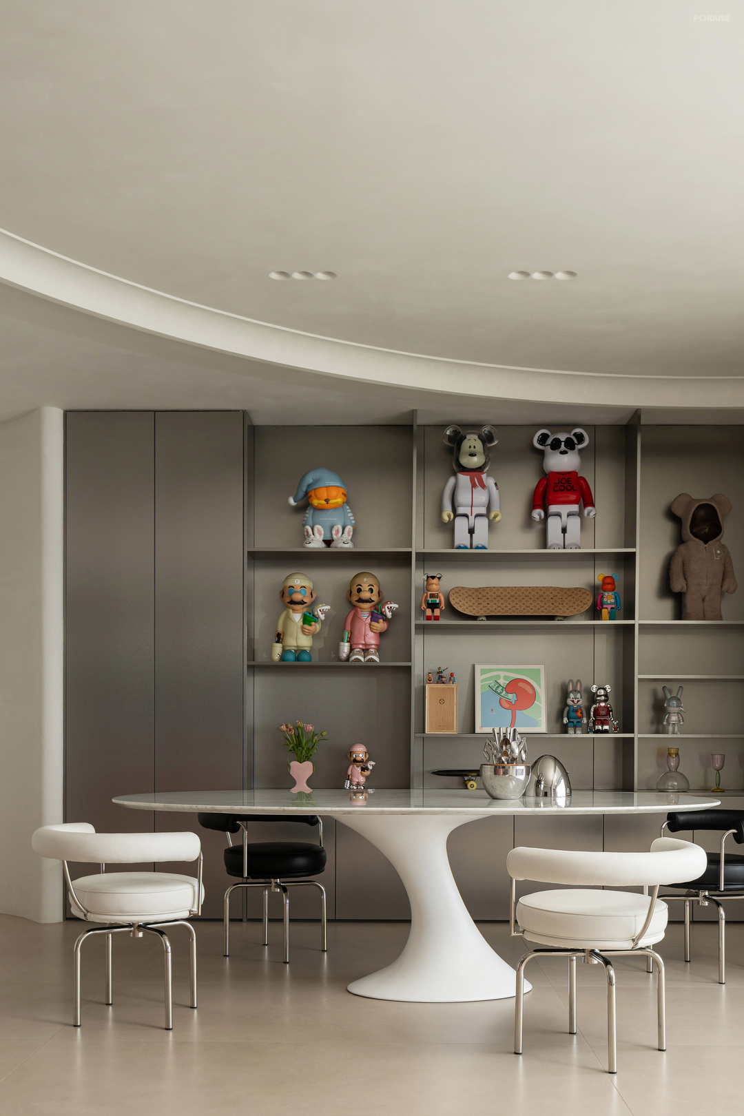 艺术源自生活,生活被艺术所滋养。跳跃的色彩,营造澄澈温柔的梦幻之境,卡通玩偶摆件与造型各异的家具戏剧性相遇,碰撞出别样的火花,赋予用餐空间更多的灵动艺术氛围。