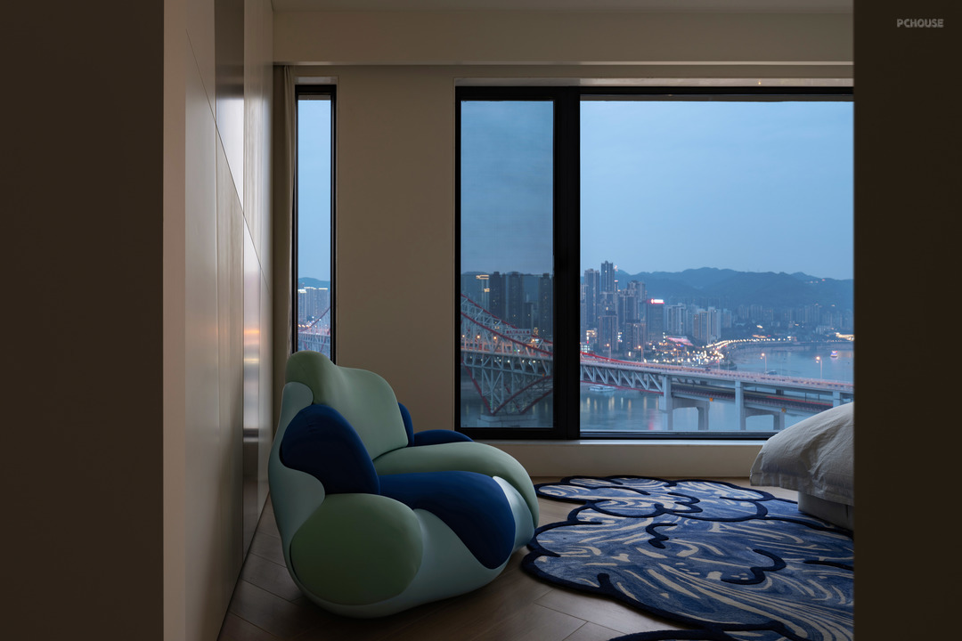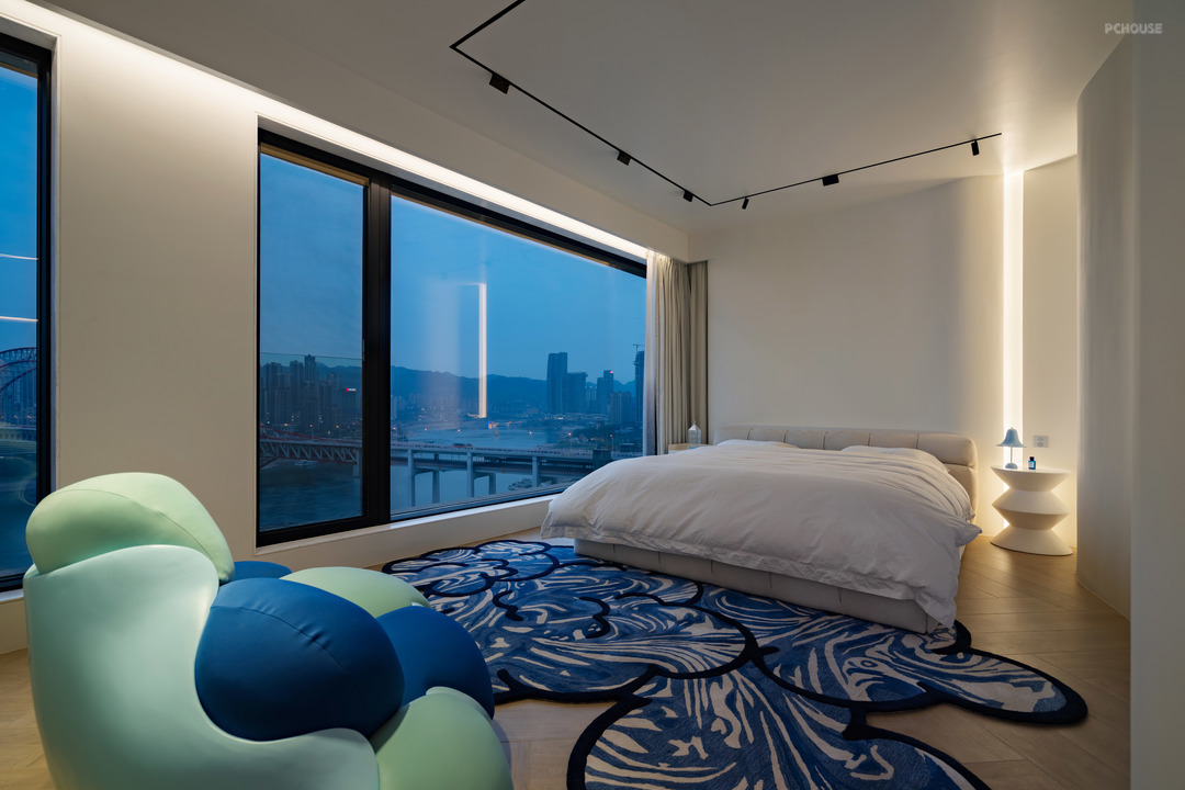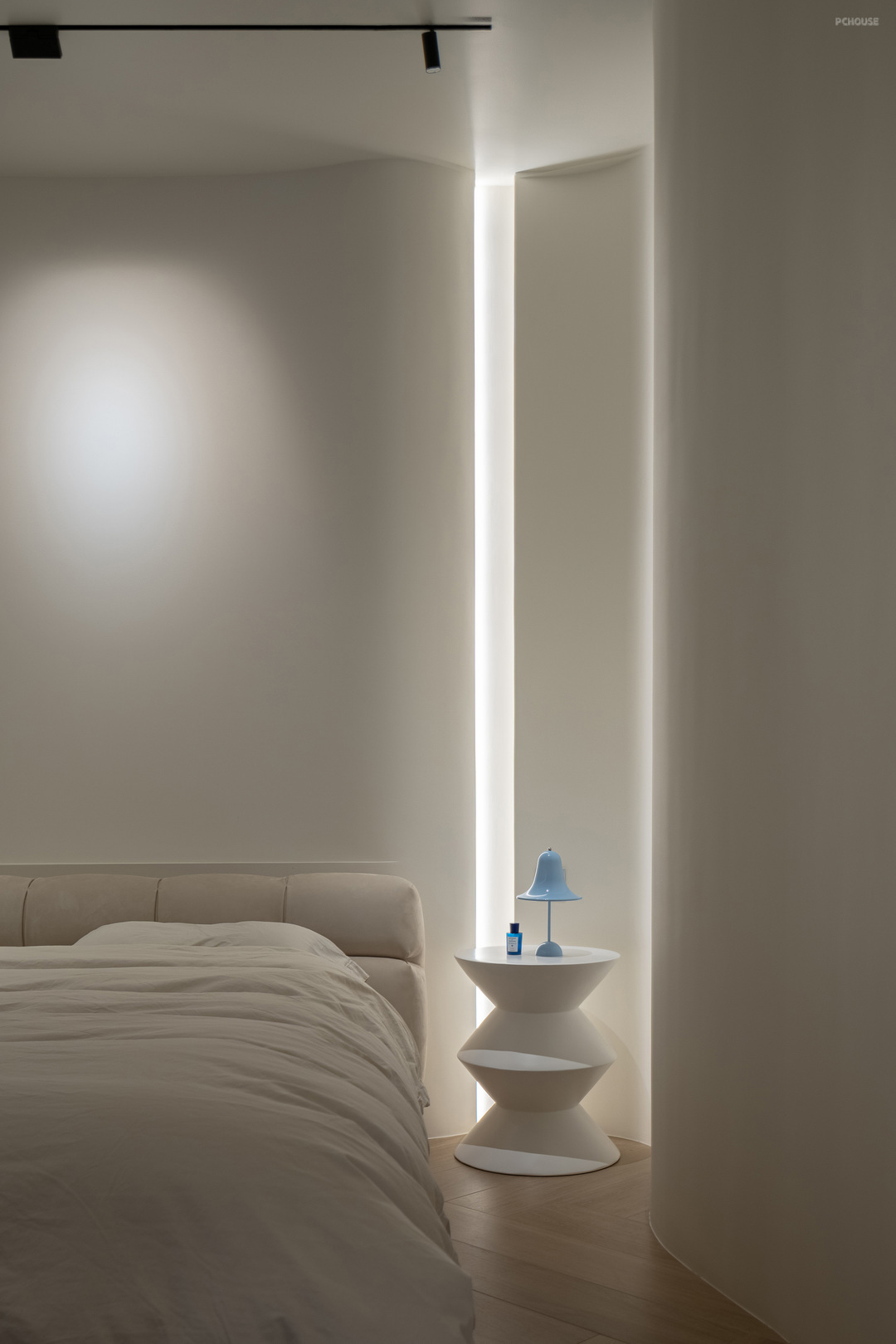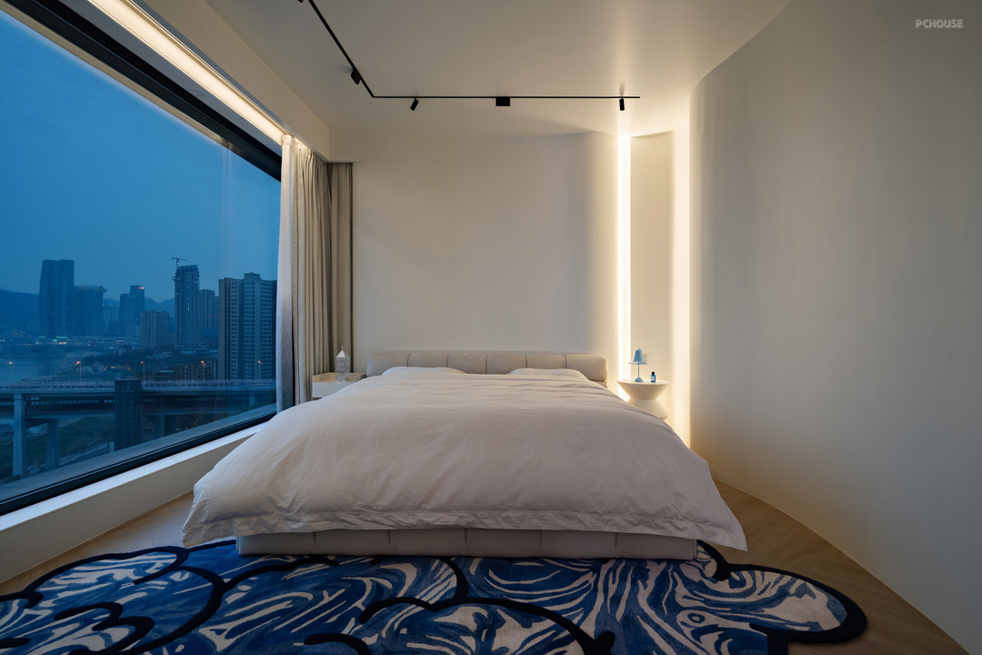 设计师仔细斟酌床榻、织物、地毯等定制家具的选择,以独特的方式寻求生活与艺术之间的微妙平衡,内饰透过清透和谐的暖白基调,让居者可以快速进入休憩疗愈状态。
