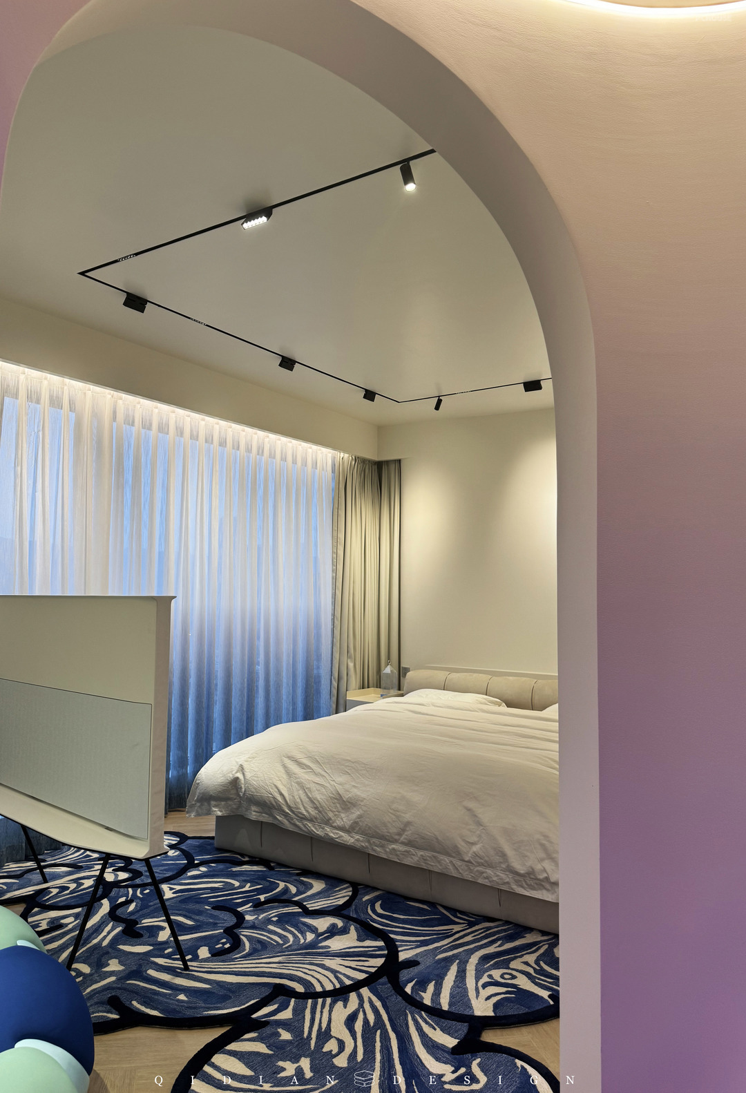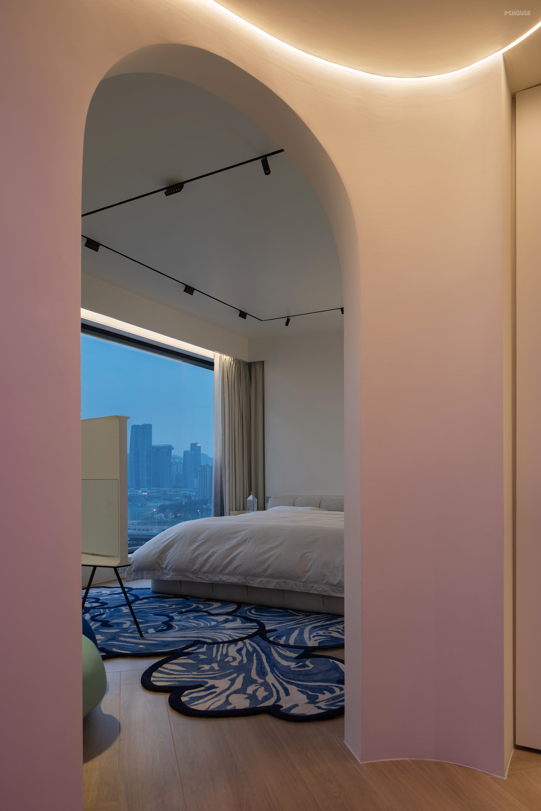 主卧在细腻与饱满之间得到了微妙的平衡,灿烂色彩带来愉悦感,引入温柔的自然光线,整个空间通过灯光与阳光的照射,色彩似乎晕染开般,带来柔软令人放松的安全感。
