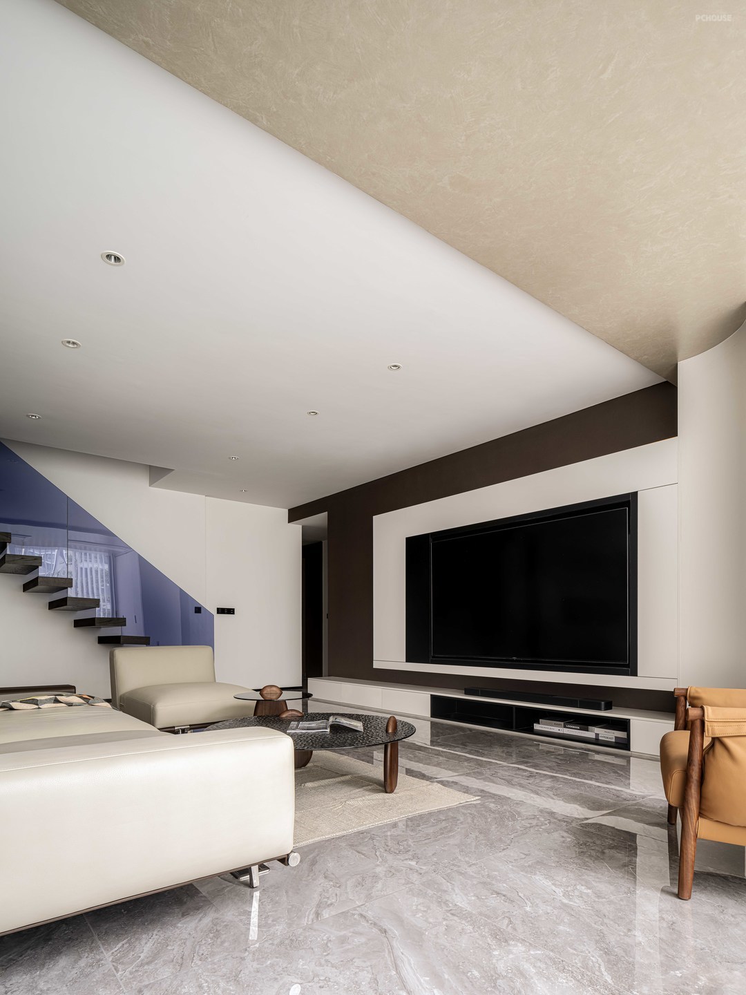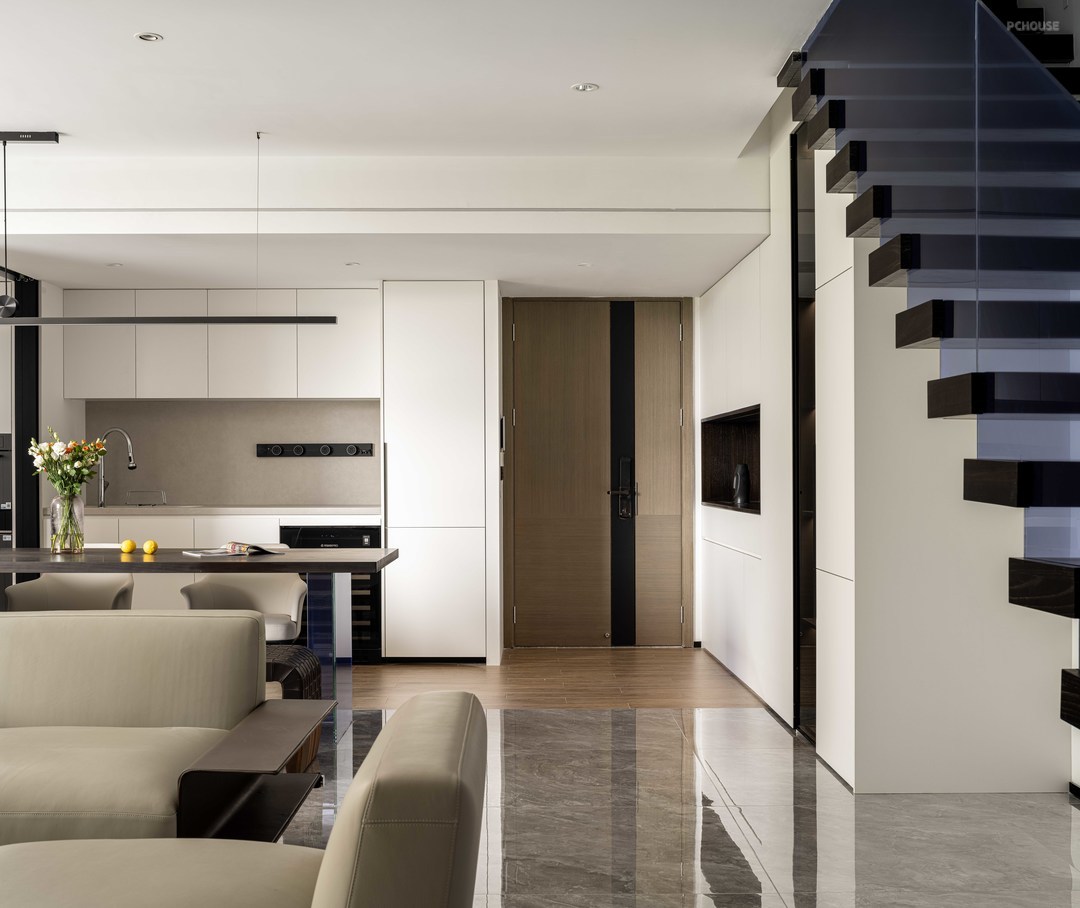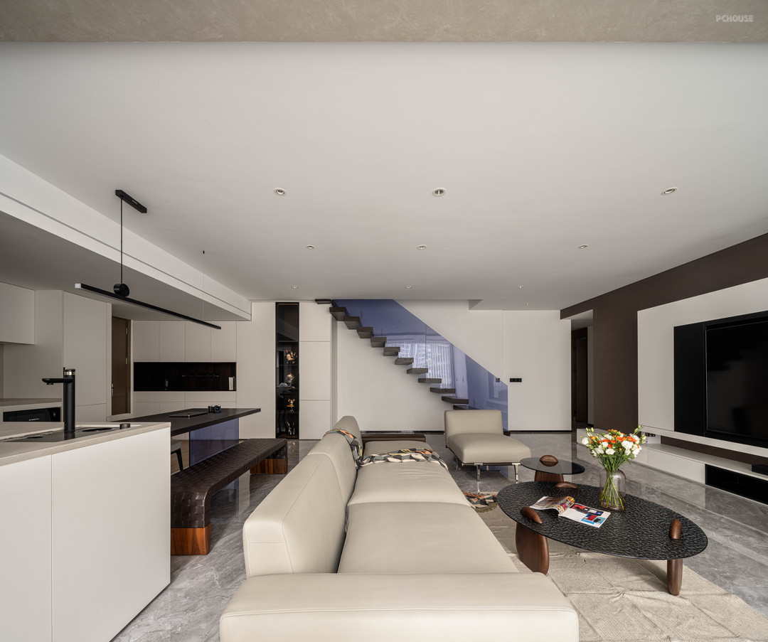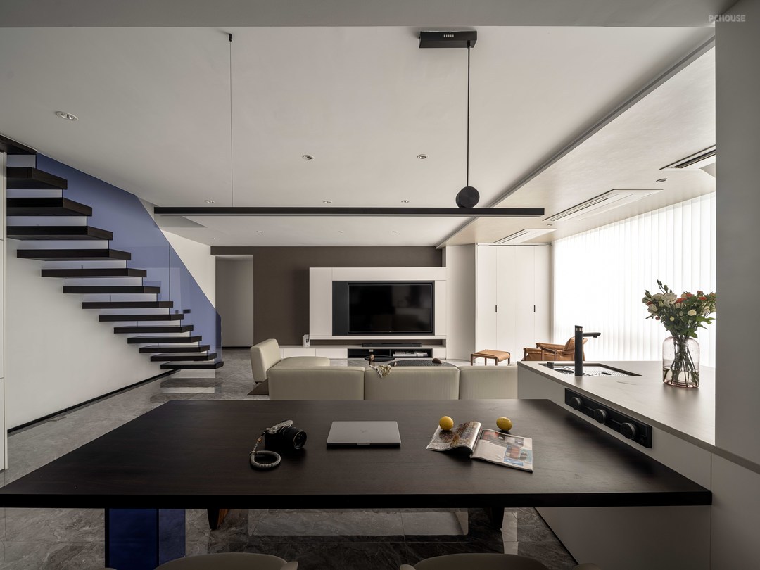 再往里面走几步,就可以看见拥有四十多平方米的超大客厅。餐桌,沙发,楼梯都采用开放式设计,整体视线毫无遮挡地看见电视墙的最深处。