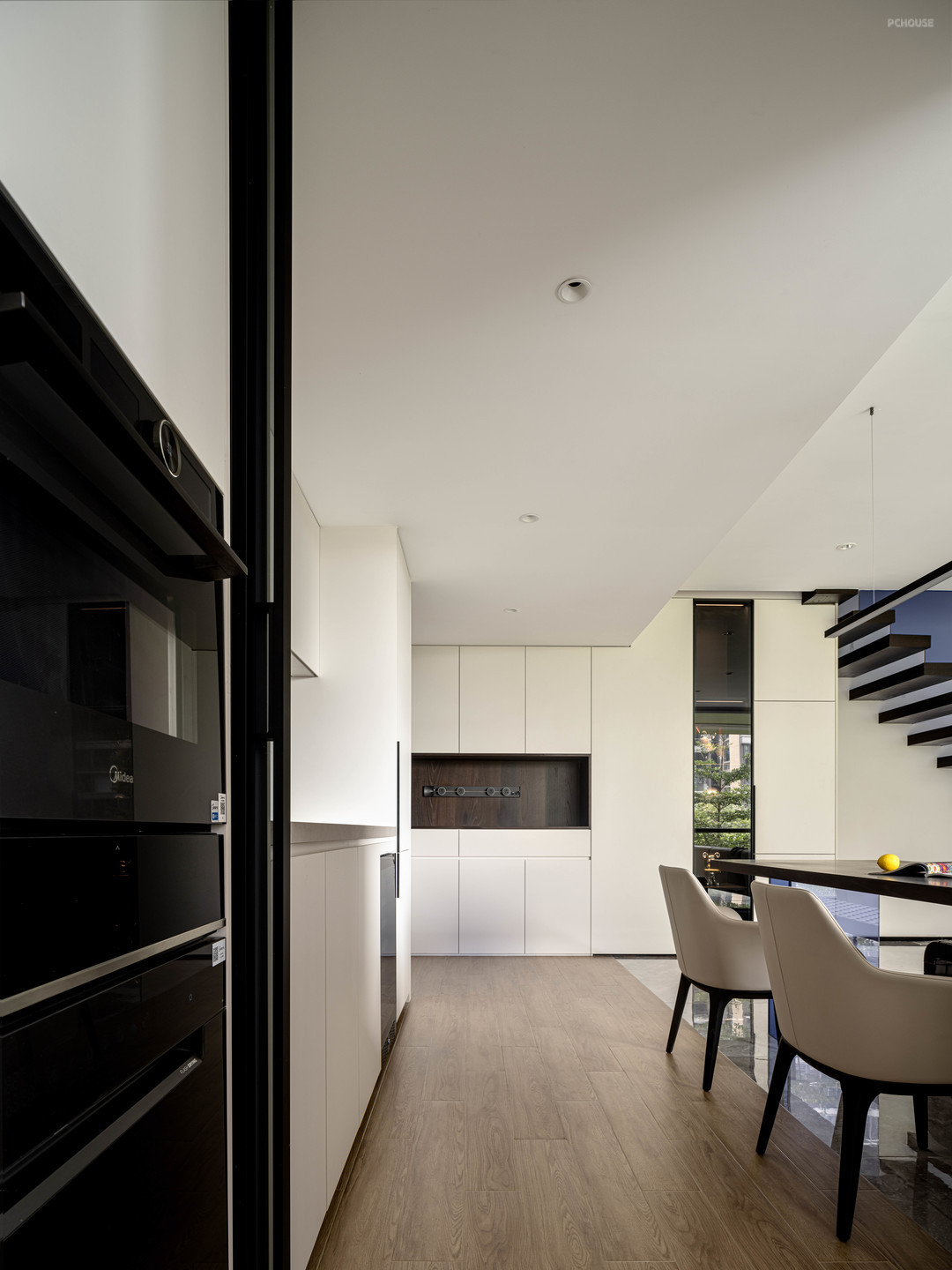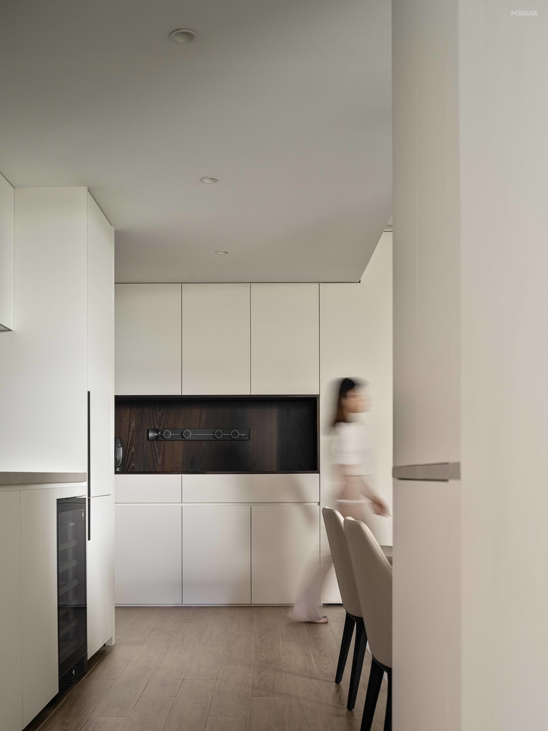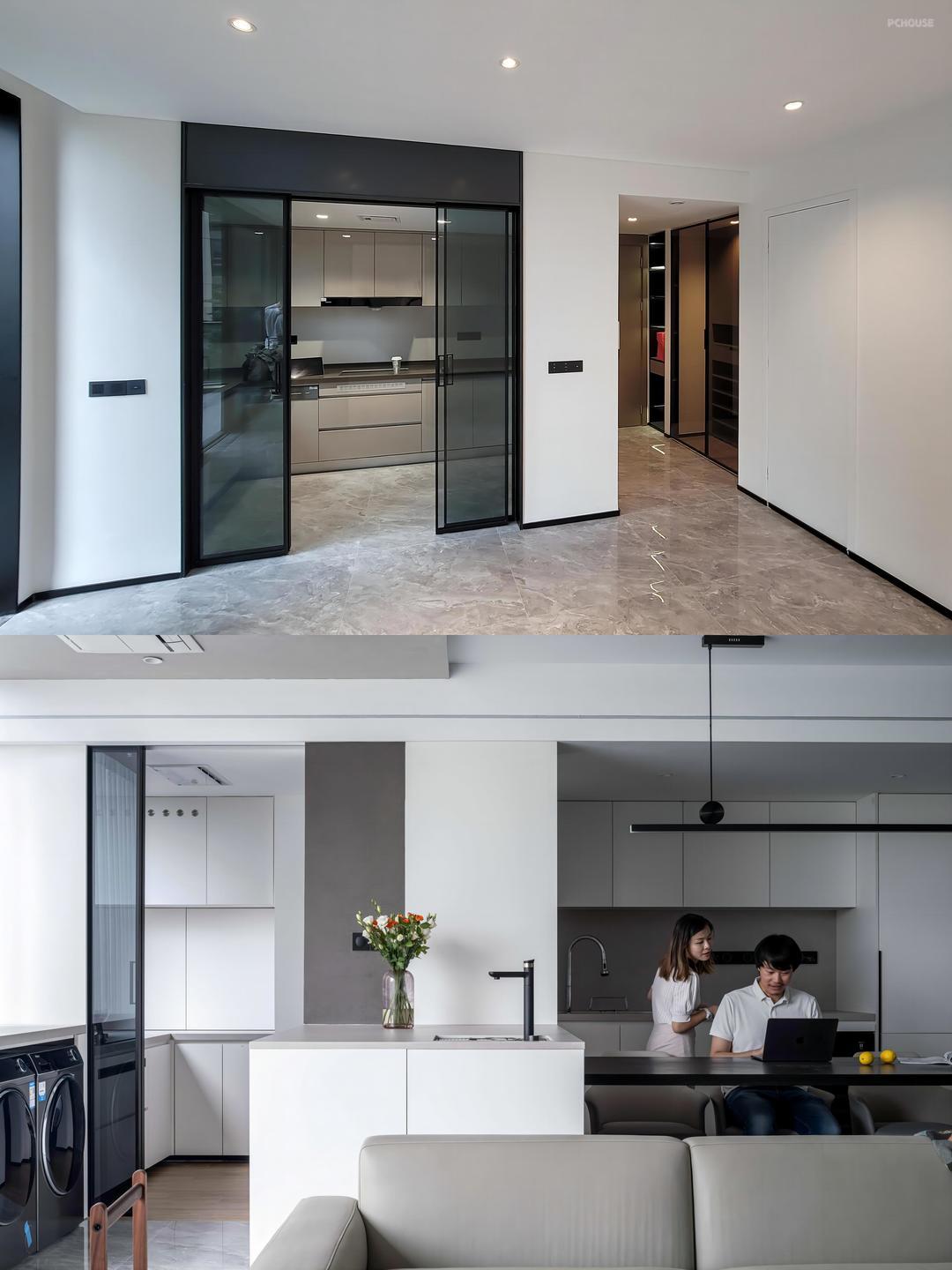 厨房改动到阳台后,采用暗藏轨道门进行功能分区。