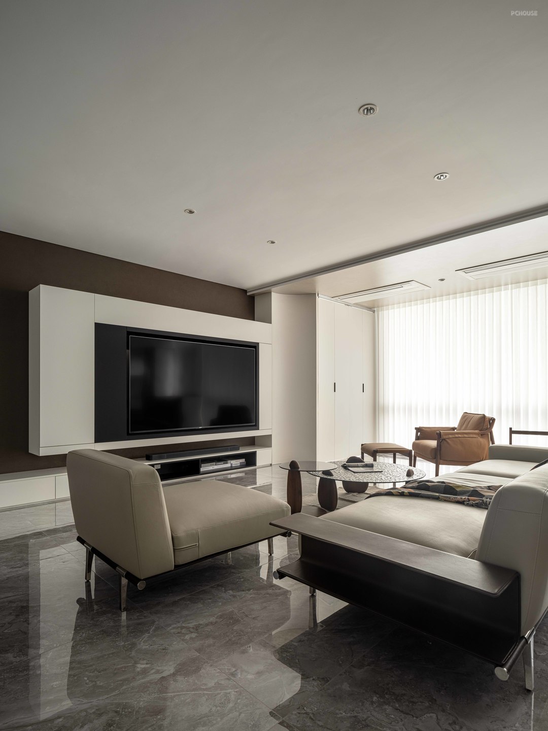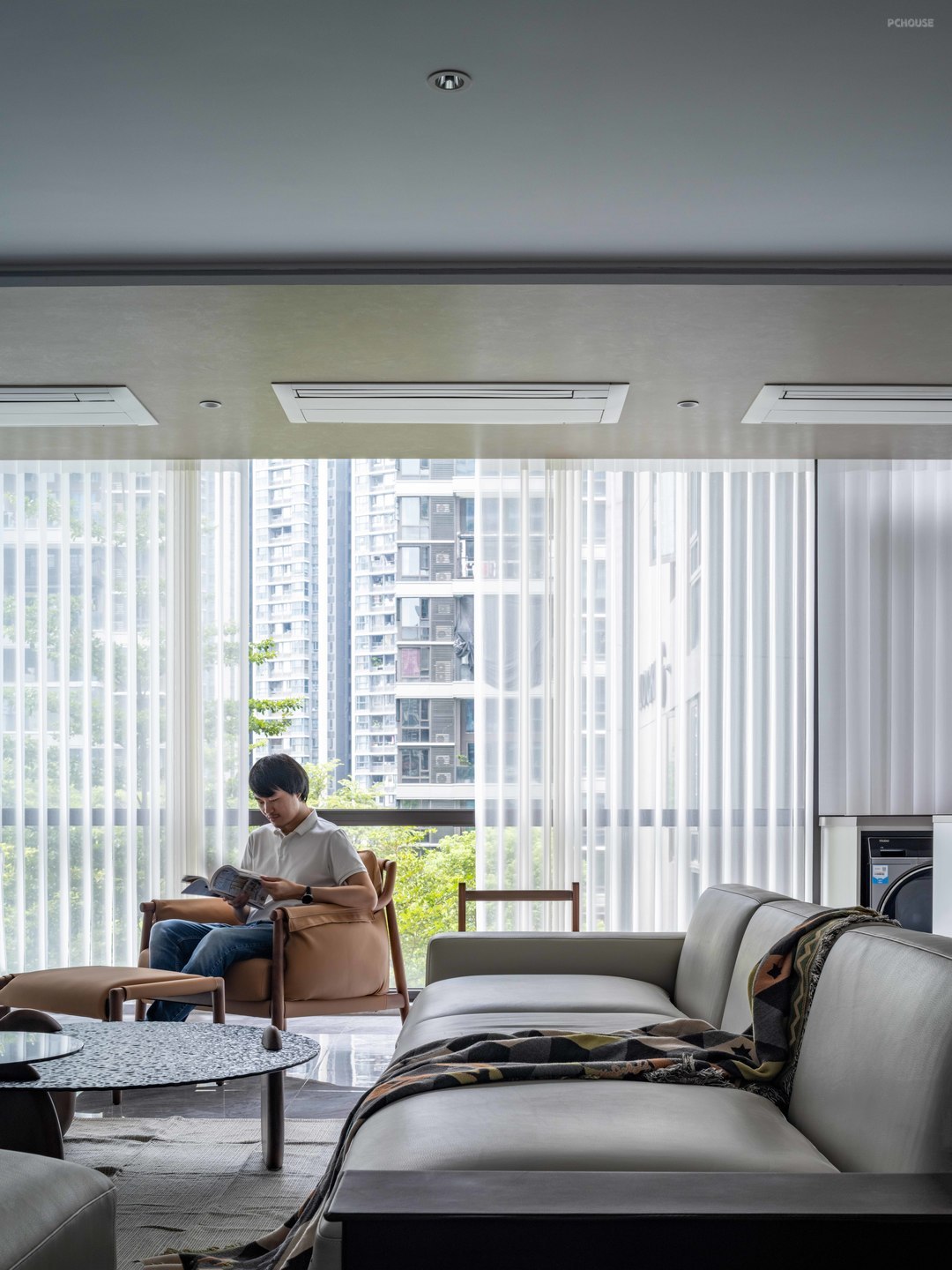 中置的沙发选用“LIGNE ROSET”家的PRADO沙发,沙发的靠背双边都可以拿取和坐人。
