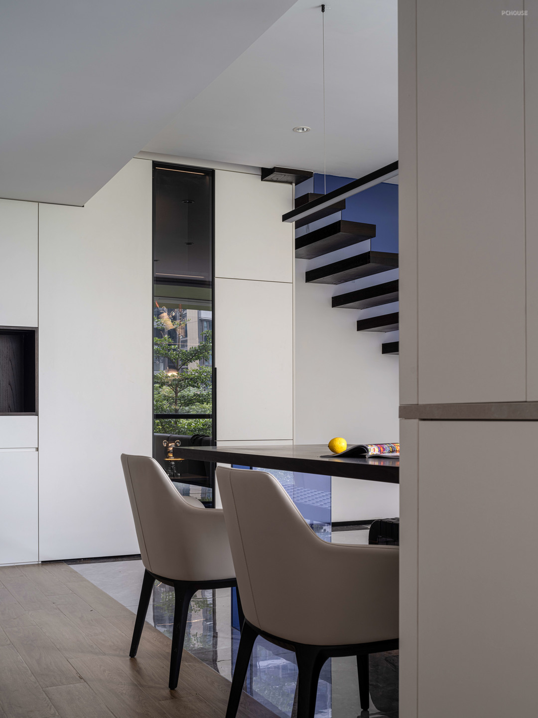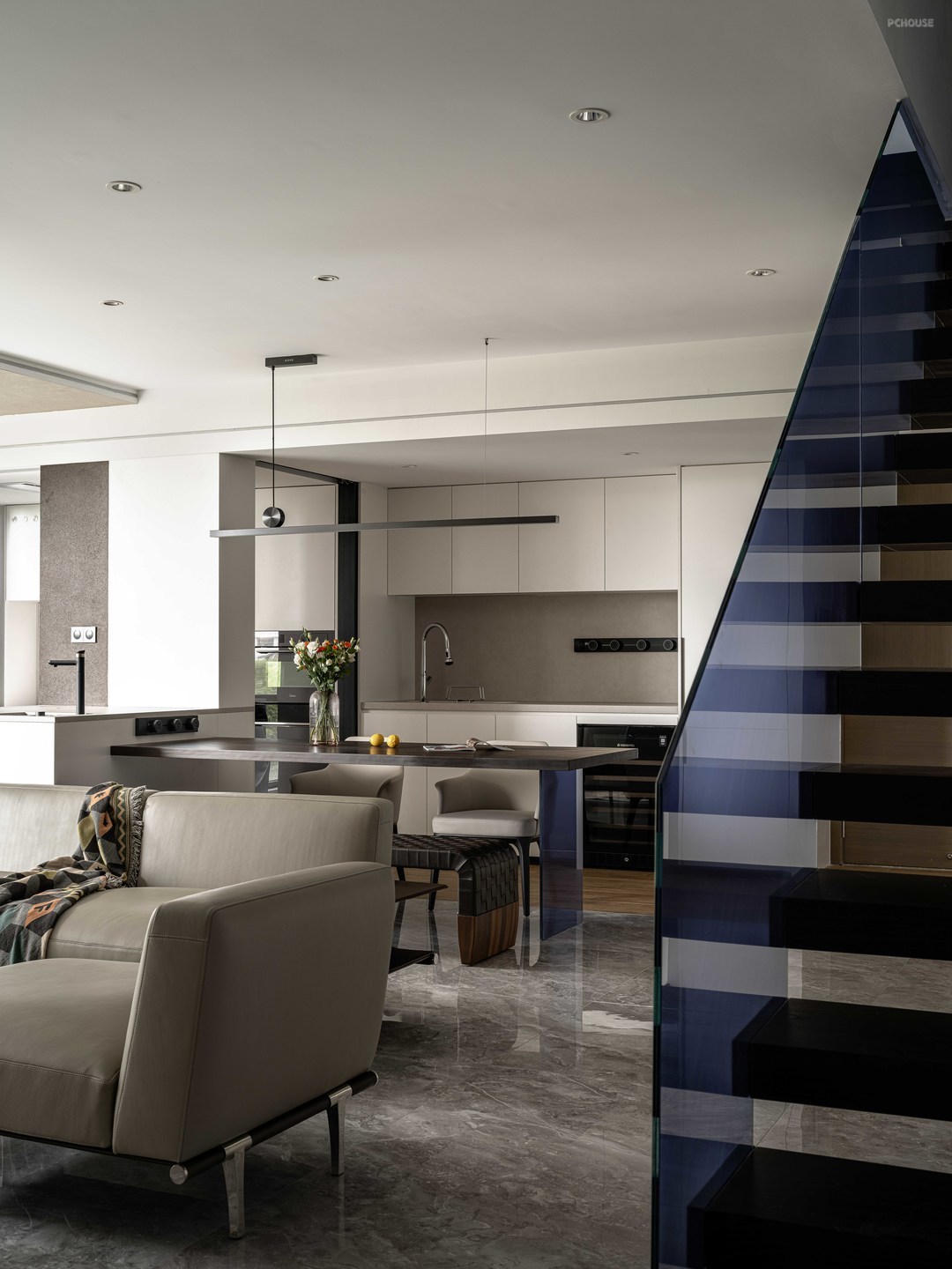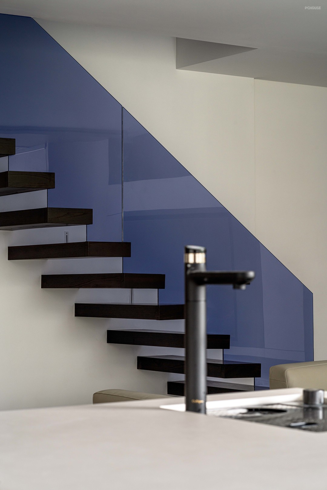 楼梯玻璃扶手的面积在空间中占比不大,扶手+餐桌桌腿的位置正好作为长春花蓝粹色玻璃的展示。