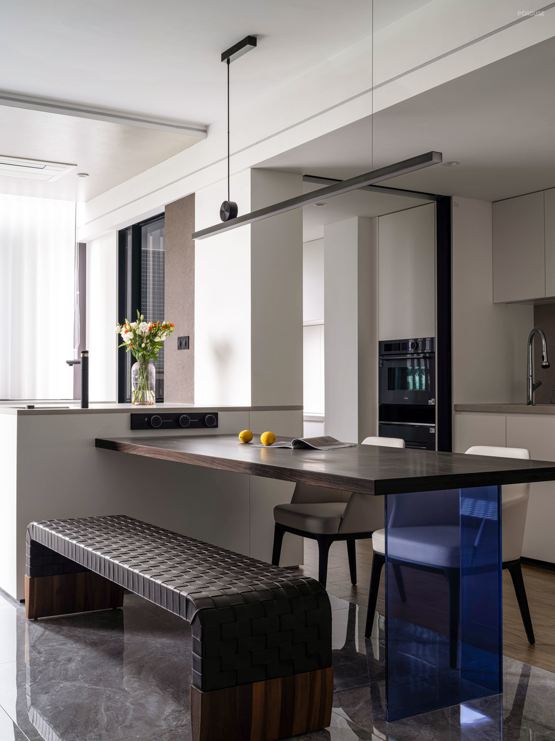 靠近沙发一侧设计条凳,方便反向落座与客厅沙发形成互动,轨道插座也为餐桌上的临时办公提供电源