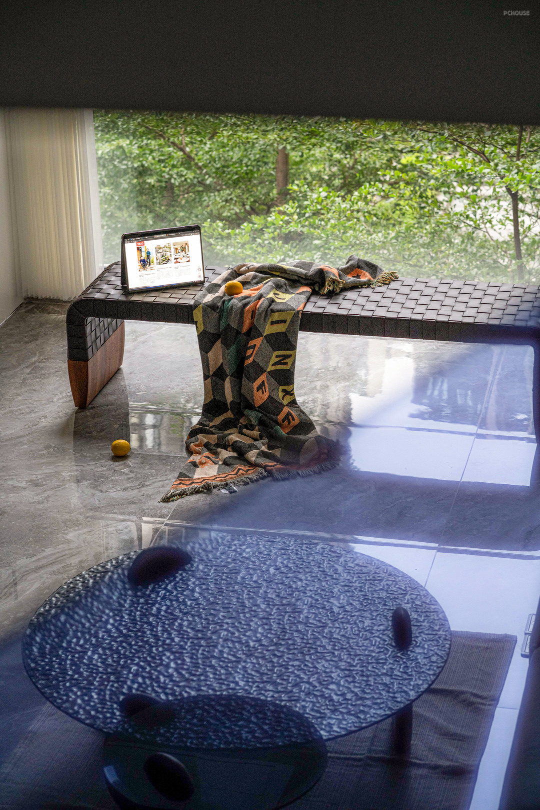 一整面采光超好的落地玻璃窗,结合窗外的绿植。仿佛窗外的风景也是空间中软装的一部分。