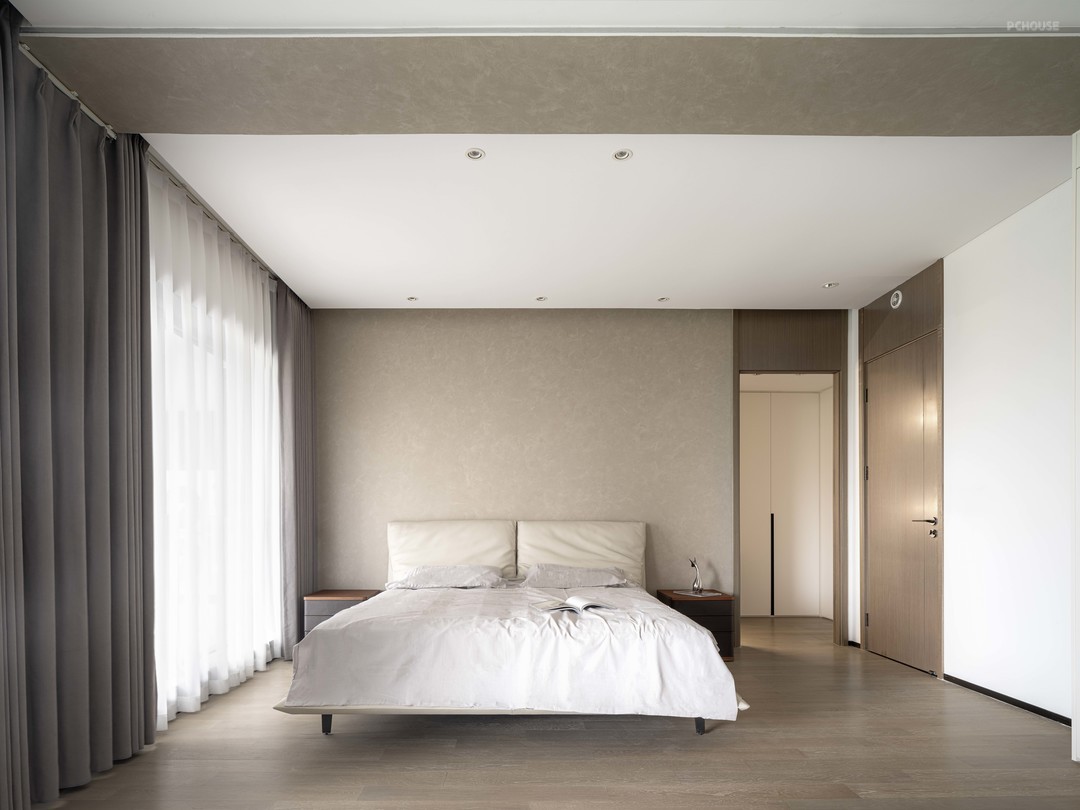 ④ 复式空间整个二楼都是主卧室的区域,于是完全调转床的摆放方向,面朝外面最好的风景。