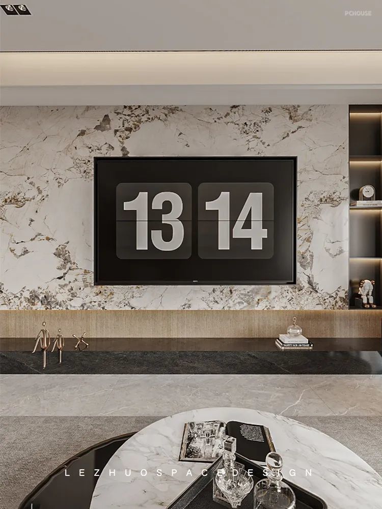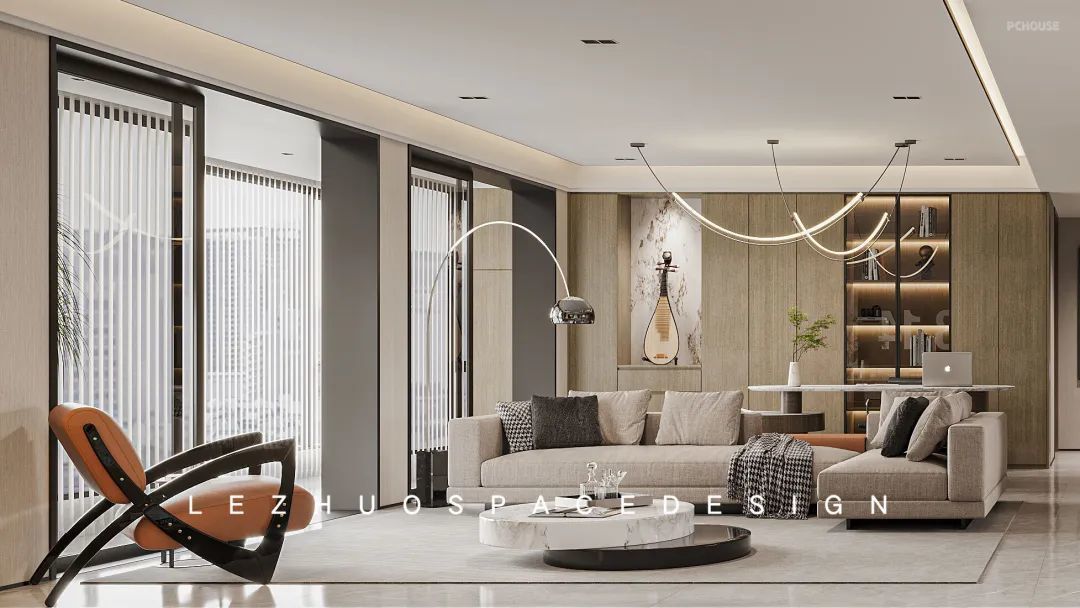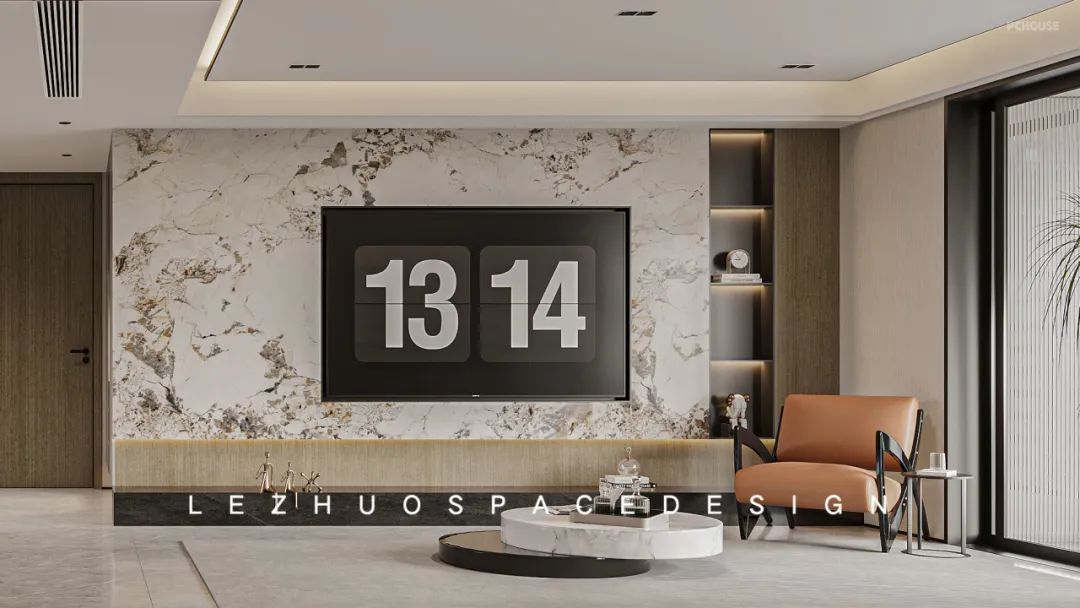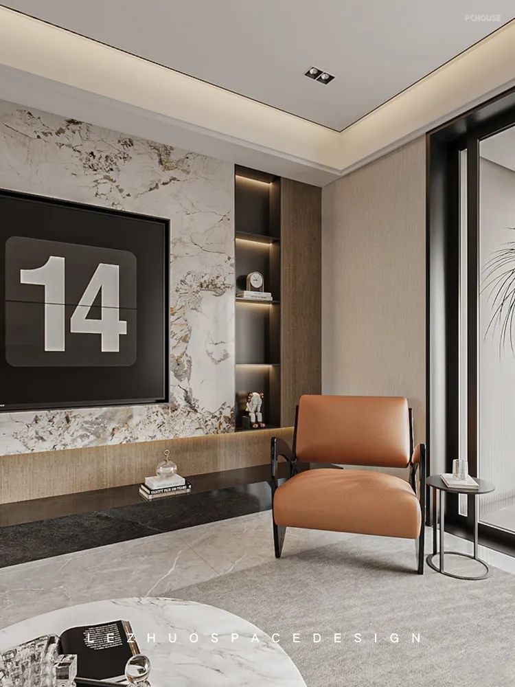 电视背景墙将电视嵌入岩板背景之中,独特而不哗众的姿态,呈现出空间的与众不同。长条木质置物柜于跳跃中增添几分优雅,配合灯带设计,突出墙面层次感,强调了视觉重心。丰富的视觉感同样来源于另一面墙体柜,木质与岩板、黑咖透明柜门的搭配,从观感上入侵,配合古典琵琶元素的融入和雅致藏品书籍的置放,让多元素风格融合,散发和谐有趣的艺术气息。不规则圆形组合茶几,更偏重艺术审美力,升维整个空间的品味。暖橙色调皮质沙发椅作为空间的点睛之笔,营造一个人独处的惬意空间。