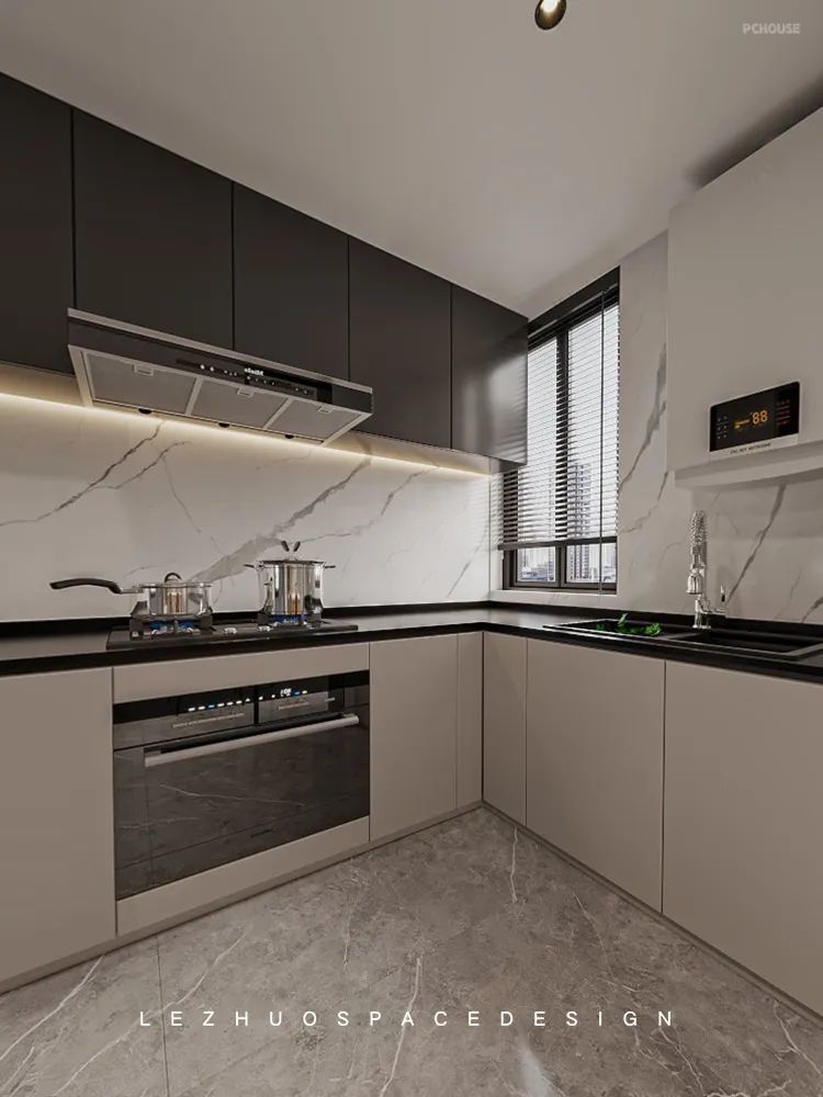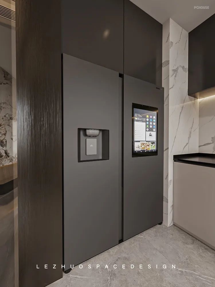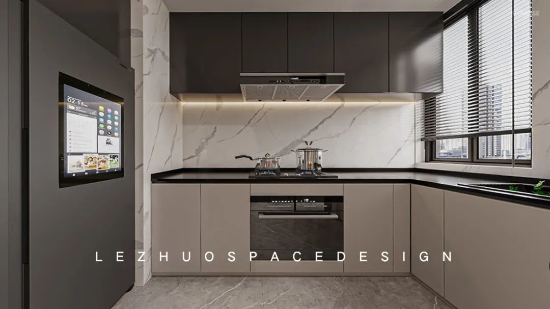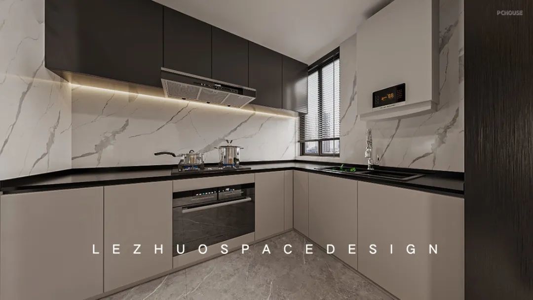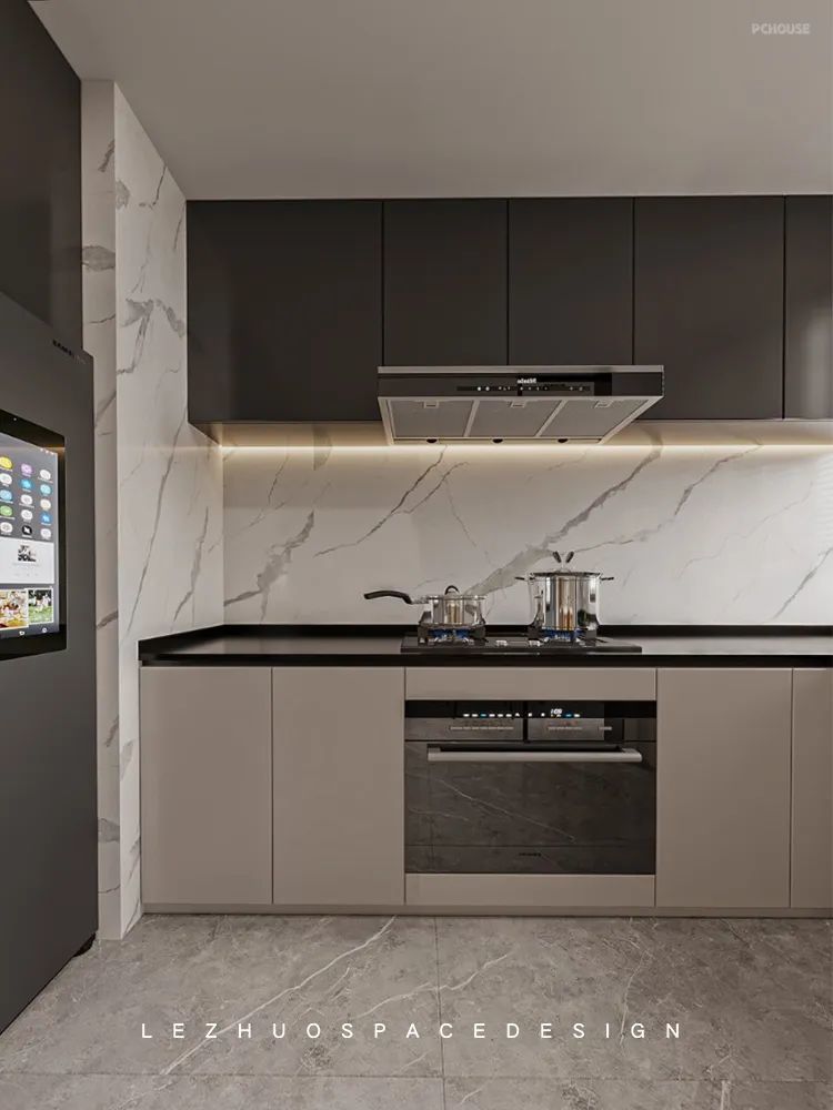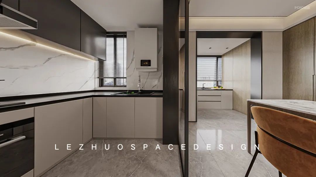 整个中厨空间进行U型布局,流畅动线,带来顺滑烹饪体验。羊绒灰与黑色岩板进行搭配,奠定简约时尚格调,嵌入式冰箱的融入,提升整个空间的质感。地柜与吊柜的经典组合,带来强大的收纳功能。设计师考量使用者的习惯及身高,量身定制橱柜尺寸,便捷每一次的烹饪时光。西厨与餐厅无门隔断,形成连贯洄游动线,不仅满足功能使用需求,更营造出精致不失趣味的烹饪环境。