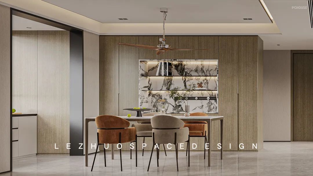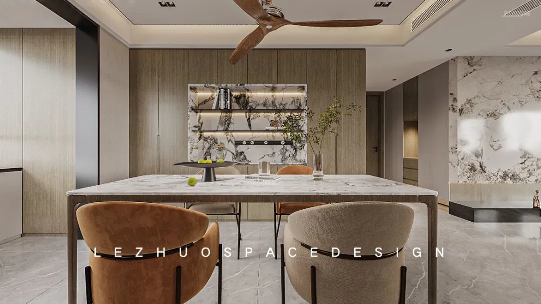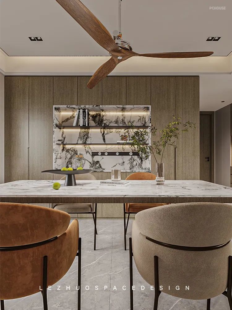整面墙的木质柜包裹岩板展示区,沉稳低调,不经意间流露奢华品味。展示柜由黑色钢板进行隔断不同功能区,满足不同储物使用需求,自带灯光系统,将注意力引入红酒、藏品的展示,彰显烟火里的艺术气息。预留充足的电力轨道插座,方便为各类电器提供电源。复古木质吊扇,成为整个空间的点睛之笔,将空间的美学力发挥至极致,高级品味不彰自显。餐桌木质与岩板的组合,与整个空间设计保持协调统一,灰色与暖橙布艺餐椅的运用,温馨整体的用餐氛围。