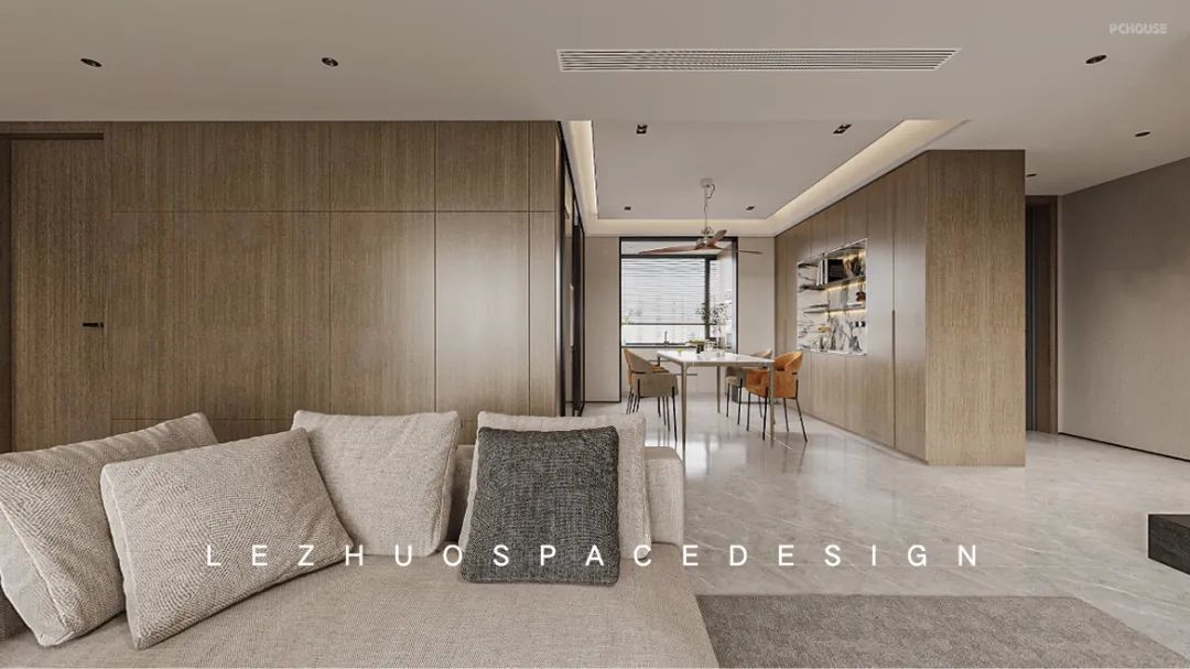 从客厅定制开始,电视柜、软装搭配等,运用分区、色彩、质感串联起空间的趣味性与互联性。区别于传统的单一布局,客厅由L型组合沙发分界为会客区与工作区,两个空间呼应的岩板与木质材质运用,空间互动又彼此相得益彰。