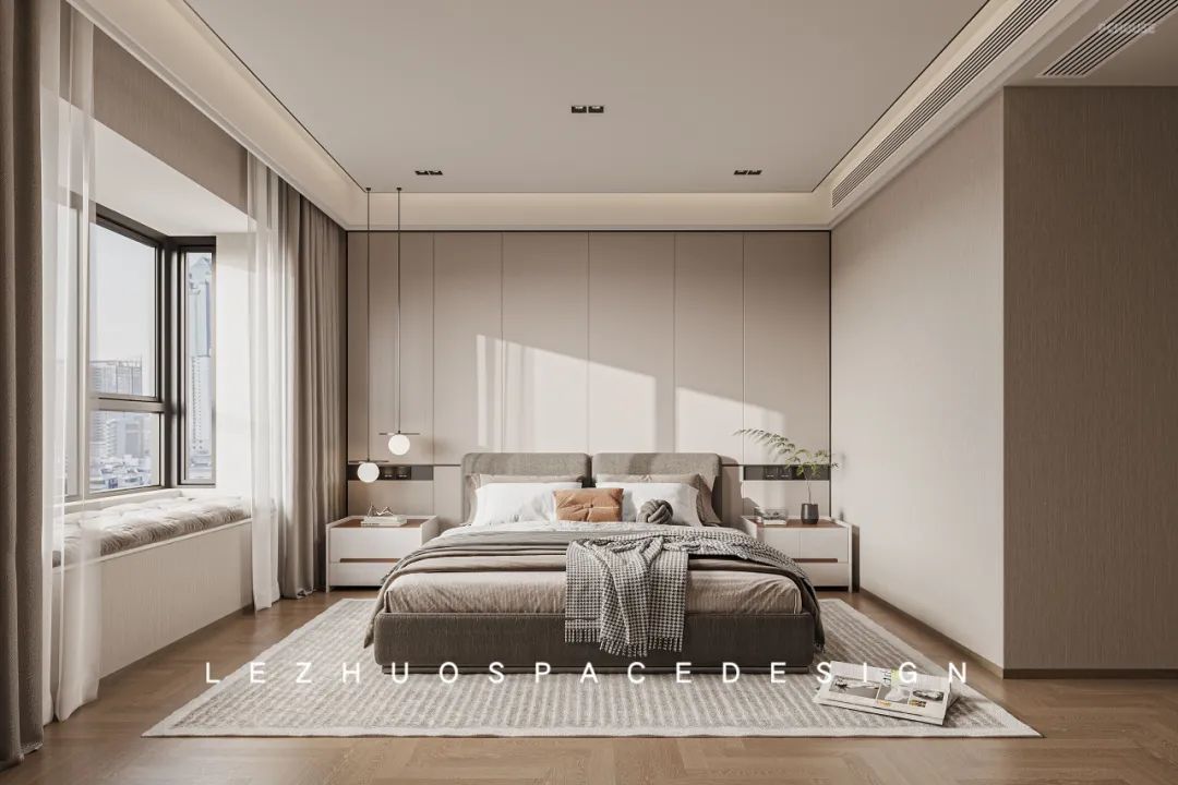 简约风尚适合抵御时间的流逝,达到理想与实用的平衡。主卧自成一片静谧天地,去除多余的装饰,只用饱和度低的米色作为主色调,以简单手法营造生活场景。床头柜体白色点缀橙棕色调,成为房间的亮点,为主卧空间平添一抹温暖。背景墙直线条有序排列,保持卧室空间的简约感与秩序感。多功能黑灰色插排直接嵌入背景墙中,满足更多电器同时使用,提升空间格调。地毯与床品选择不同饱和度的灰色系,既与空间整体调性相符,又营造出更具层次感的空间氛围感。
