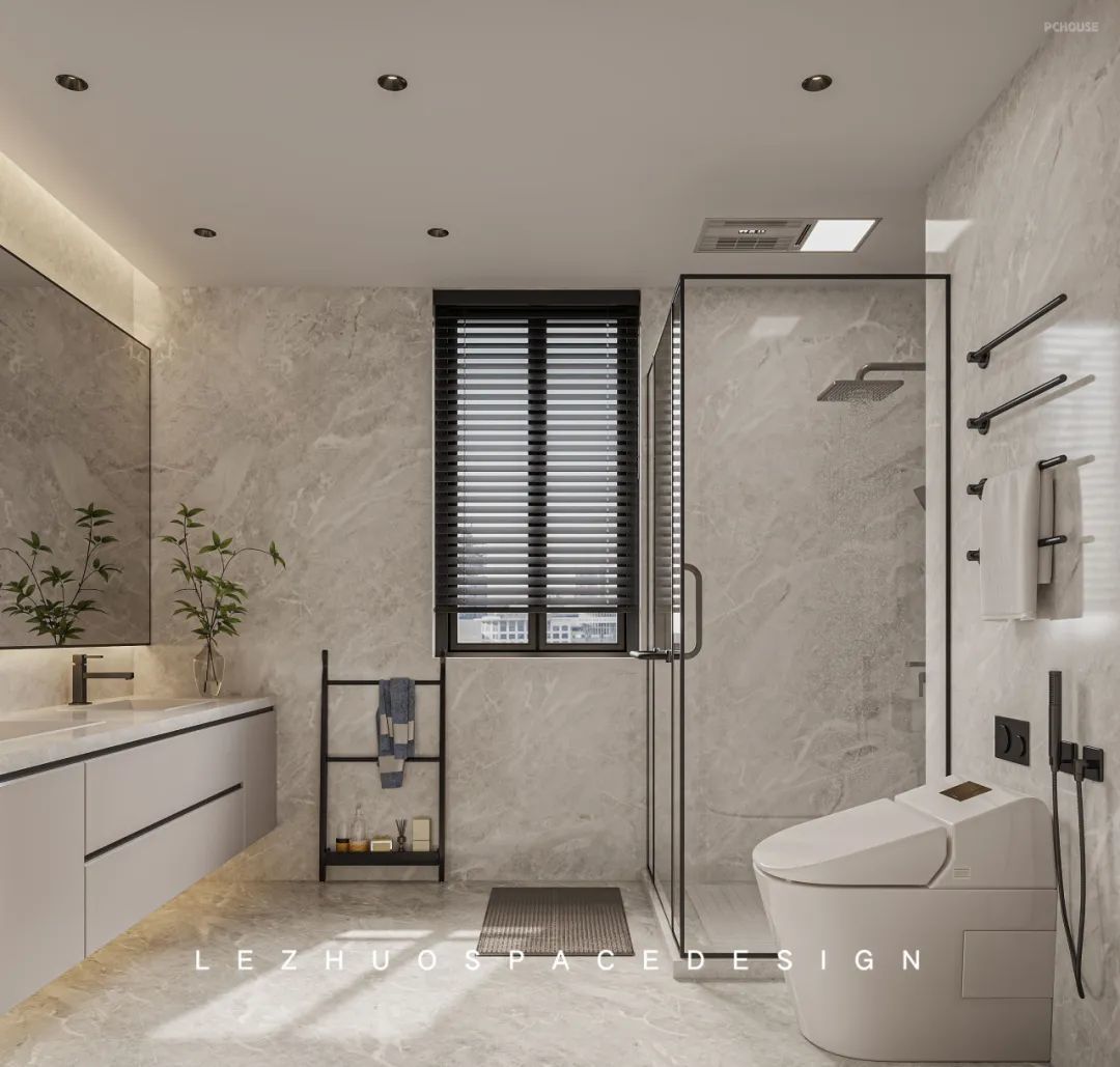 主卧卫生间整体以羊绒灰柜体与白色大理石搭配,清透视觉感营造舒适干练的洗浴空间。采用干湿分离设计,将功能加以明确划分,让每寸空间都整洁美观。定制双面盆,满足多人同时使用,大大提升使用效率。地柜悬空预留足够空间,便于日常的清扫打理。