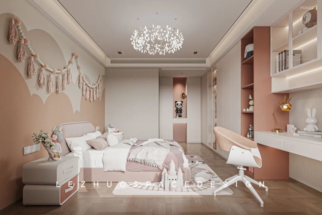 2、儿童房改变了入门方向拆除内墙,同时整体化电视背景墙,扩大使用面积;沿墙打造L型转角柜,增加收纳;