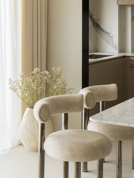 空间用低饱和度色彩调配出和谐视感,方正轮廓大理石餐桌搭配直排水晶灯,展现精致又优雅的美学。