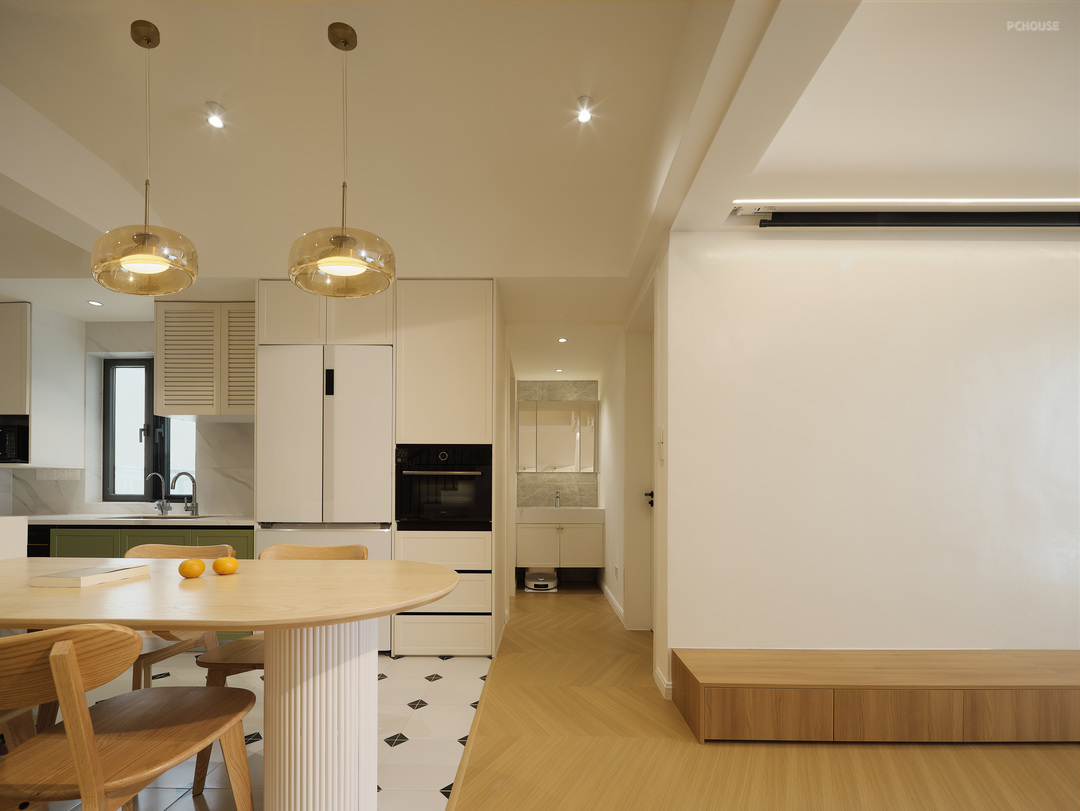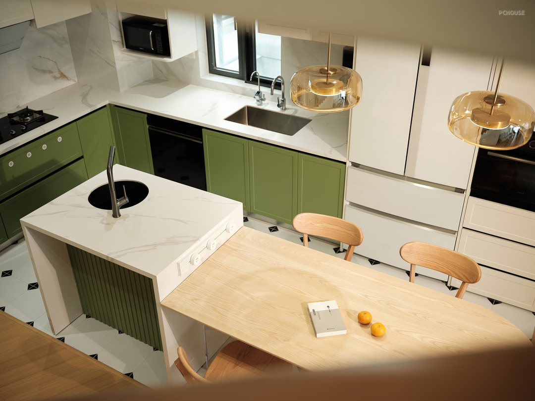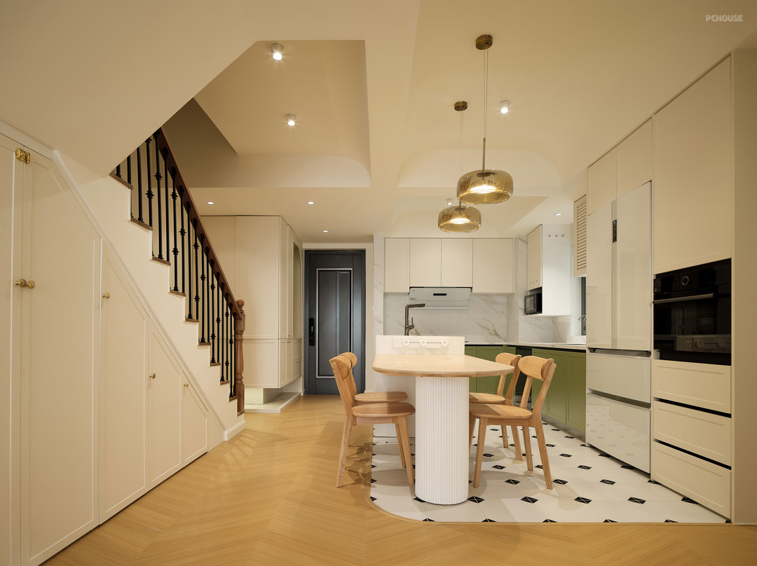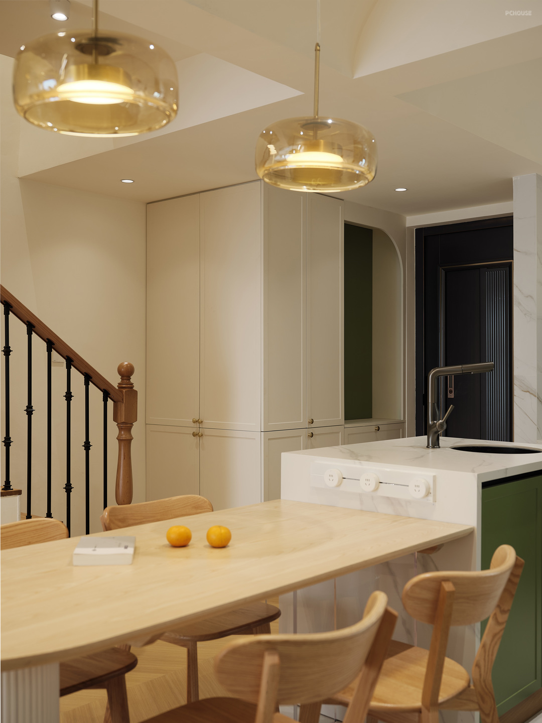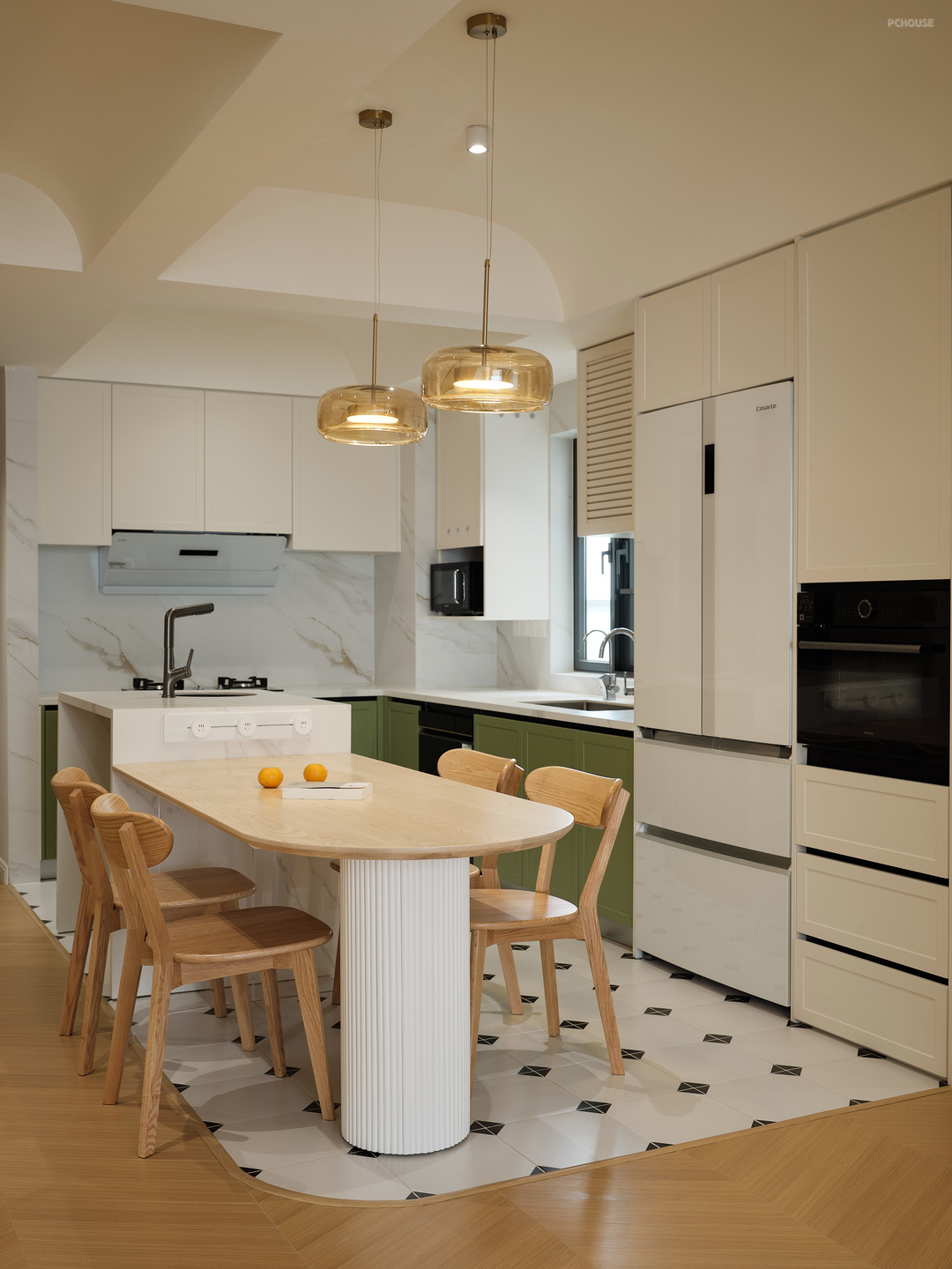 餐厨空间以小花砖与公共空间区分开,陡然而生的豆绿橱柜成为空间惹眼的点缀,显得清爽而高级;餐桌设计了拱形线条,优美的弧线让精致的氛围感呼之欲出。