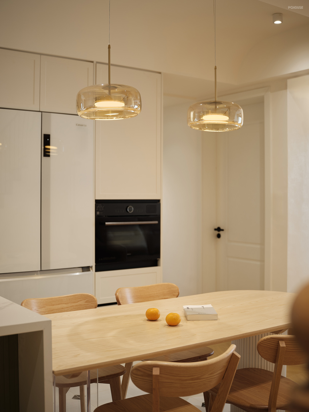 在明亮的餐厅和家人共享美食的喜悦。不论是定制的整体橱柜和餐边柜,还是同色系嵌入式冰箱,都能兼具美观与收纳功能。餐具、水壶、咖啡机、杂物、收藏的好酒、零食...都有了合适的安放之处。
