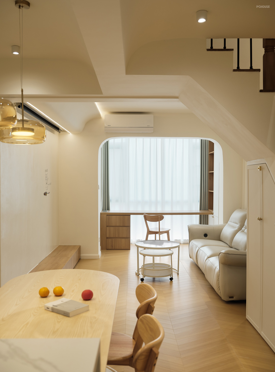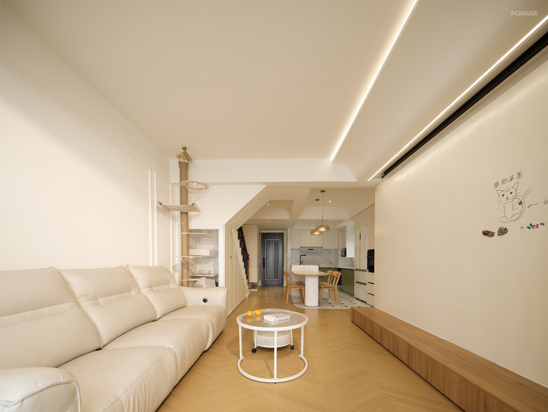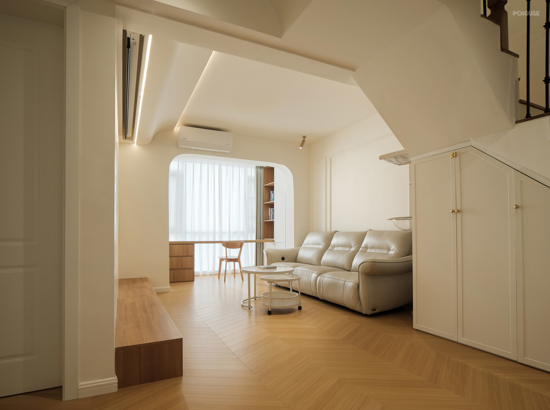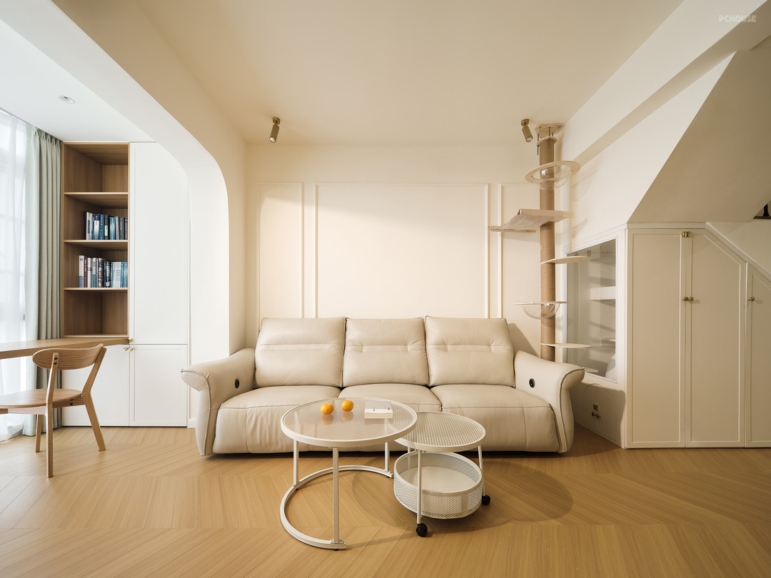 拆除原始精装房装饰后,客厅空间都以低饱和的奶油色系为主,构建了客厅的温馨感,总能让人感觉到温暖与自然,整体氛围由简陋转换成慵懒感。