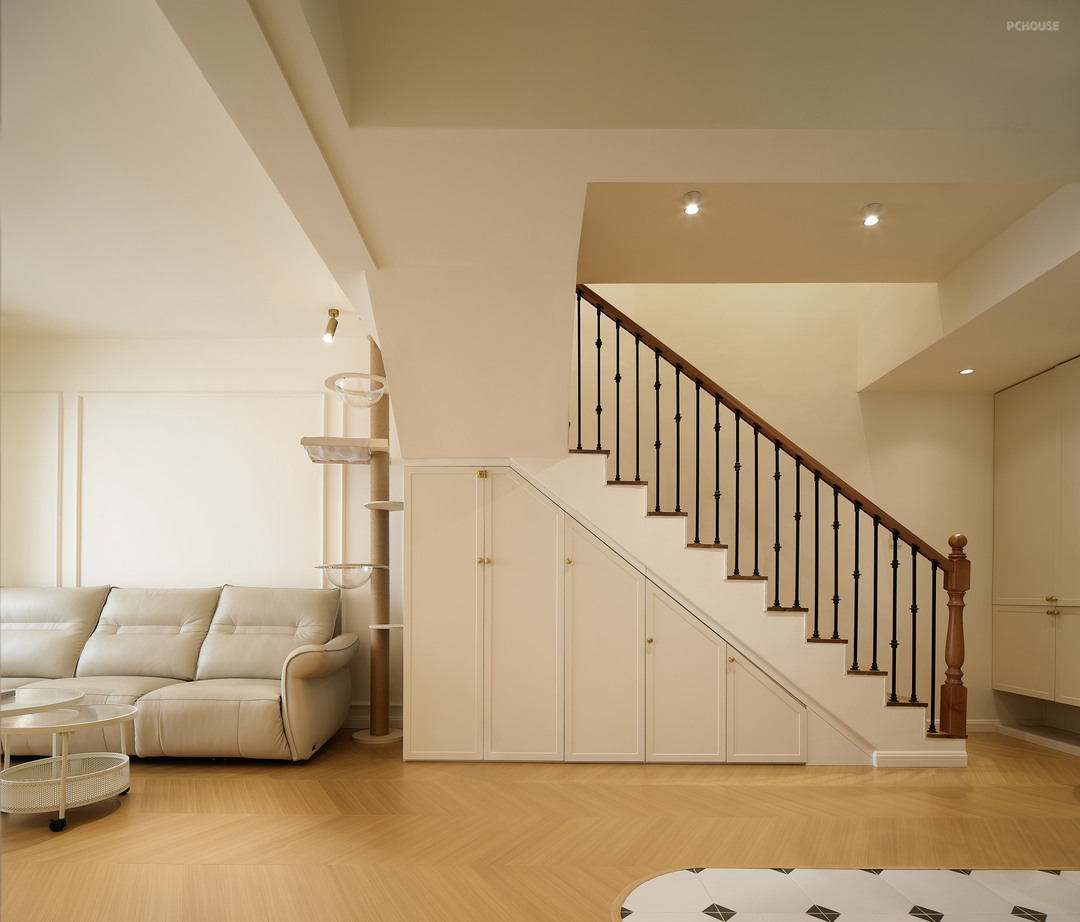 楼梯下是超大容量的收纳空间,可以放四季的鞋子和雨伞等杂物。