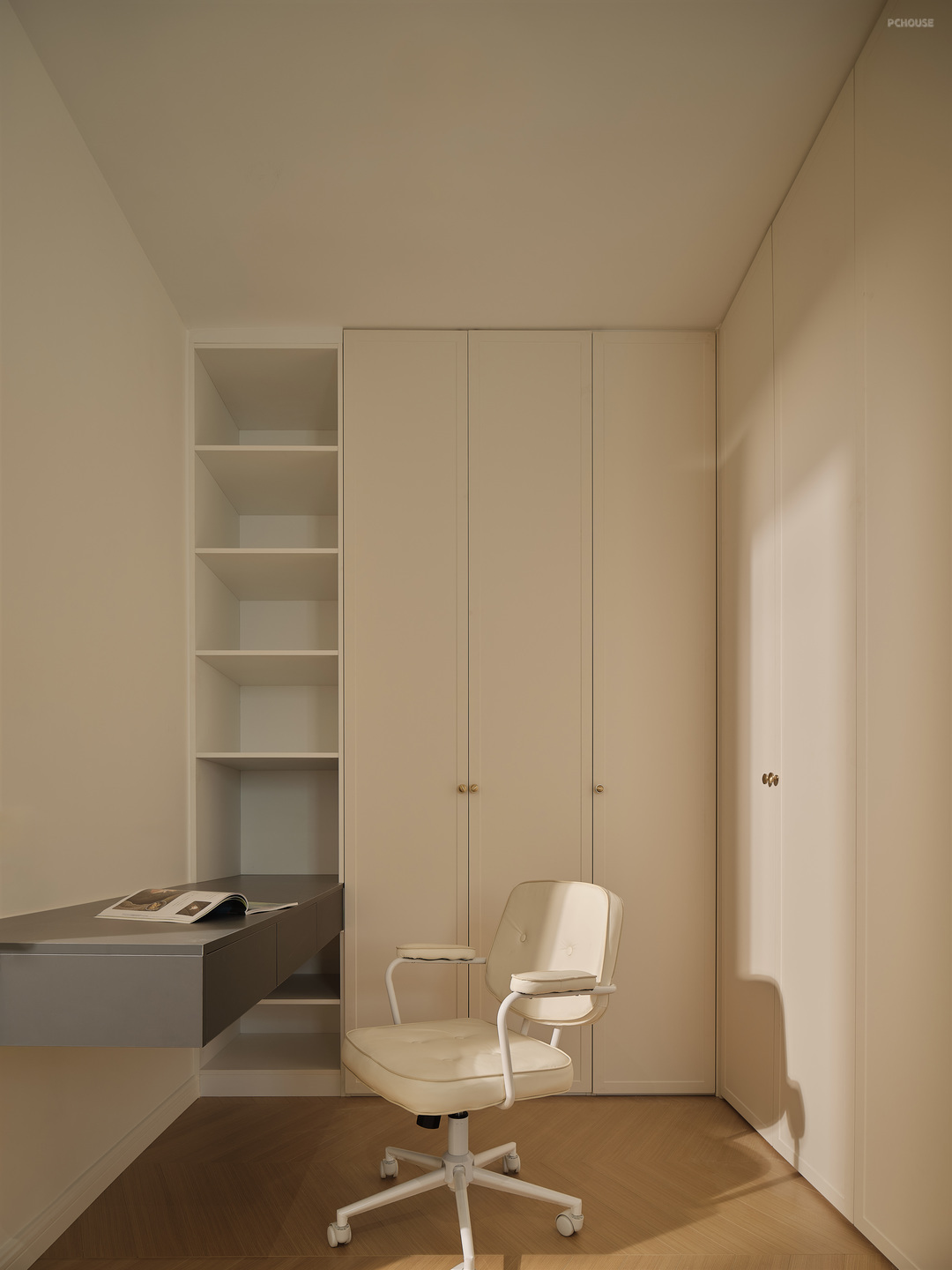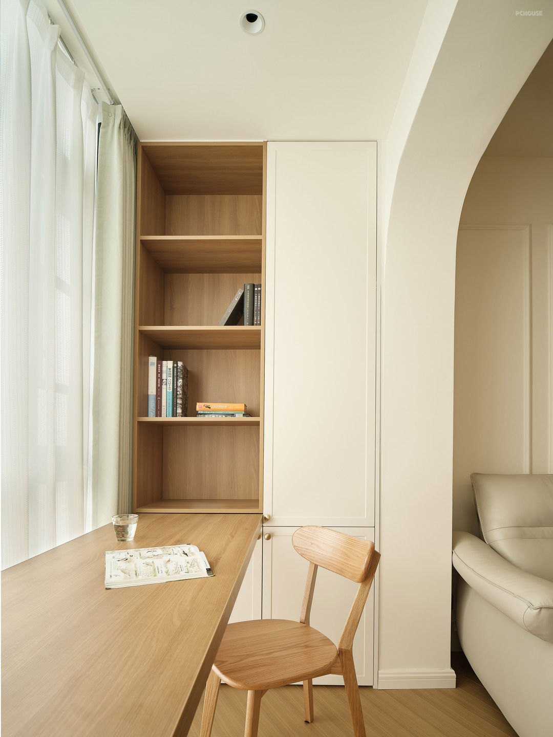 生活阳台纳入客厅,客厅面积由此放大,休闲功能得到延伸。阳台以落地窗的形式与客厅连接,借助窗边细长空间,定制壁挂开放格+书桌+地柜,1.5㎡的迷你空间解决书房难题。