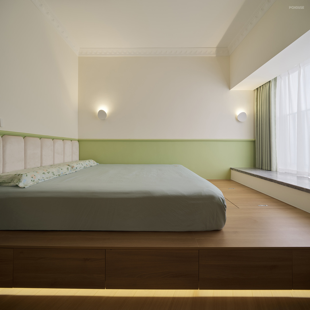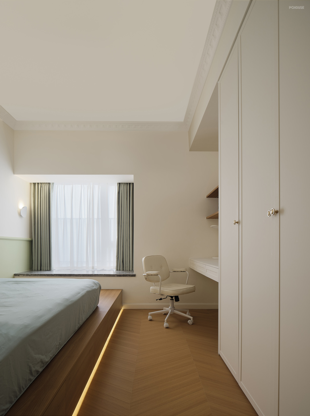 主卧整体以奶油为主,牛油果绿为辅,打造悬浮梳妆台与衣帽组合柜,简约而有设计,贯彻了实用性和舒适性。