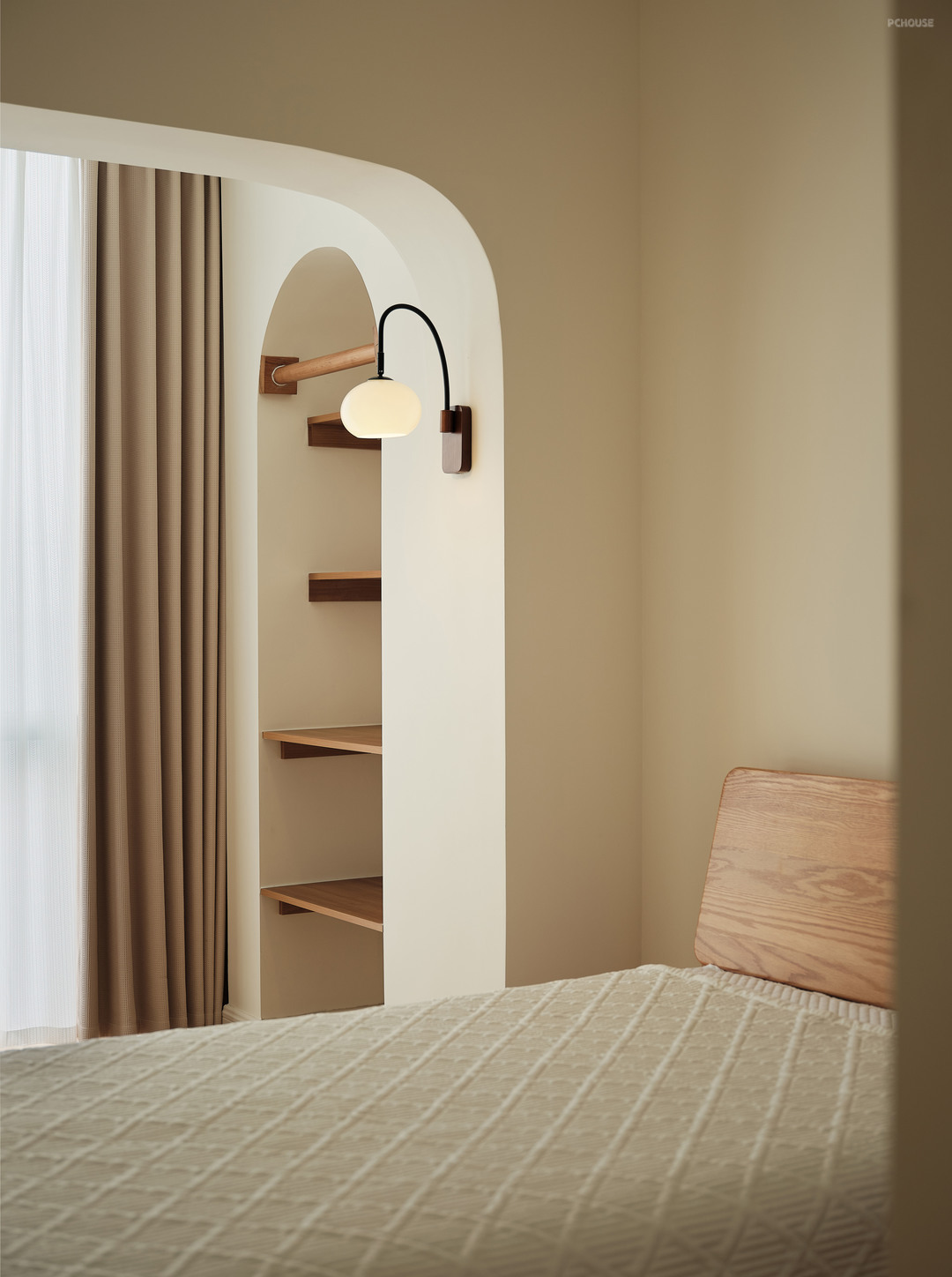 弧形造型作为软隔断,提倡空间“去棱角化”,阳台一侧用拱形壁龛打造阅读区,美观大方,成为房间里艺术一角。