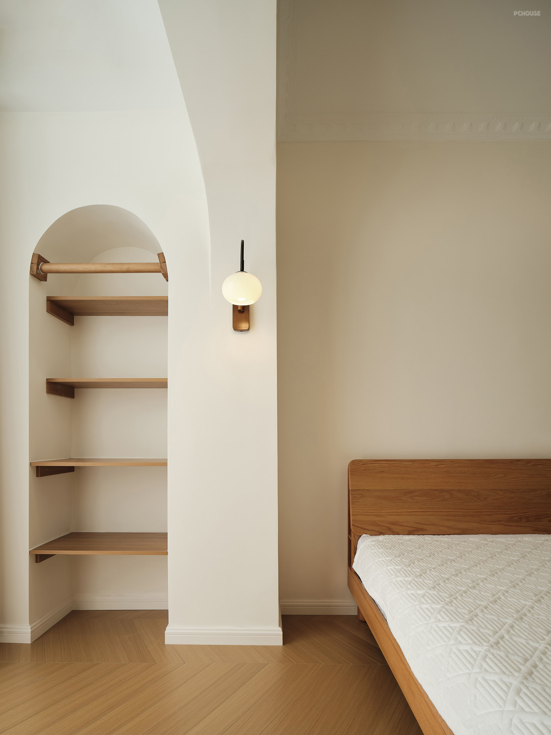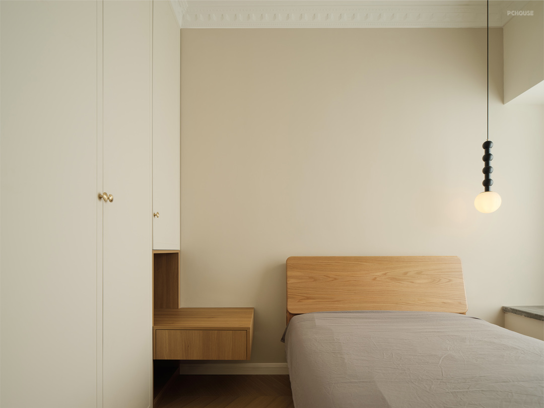 整体以奶油色作为基调,法式石膏线的点缀起到对比和突出的视觉效果。衣柜底部延伸出床头柜,实用耐看。复古吊灯暖意蔓延,在功能与氛围感之间取得巧妙平衡。