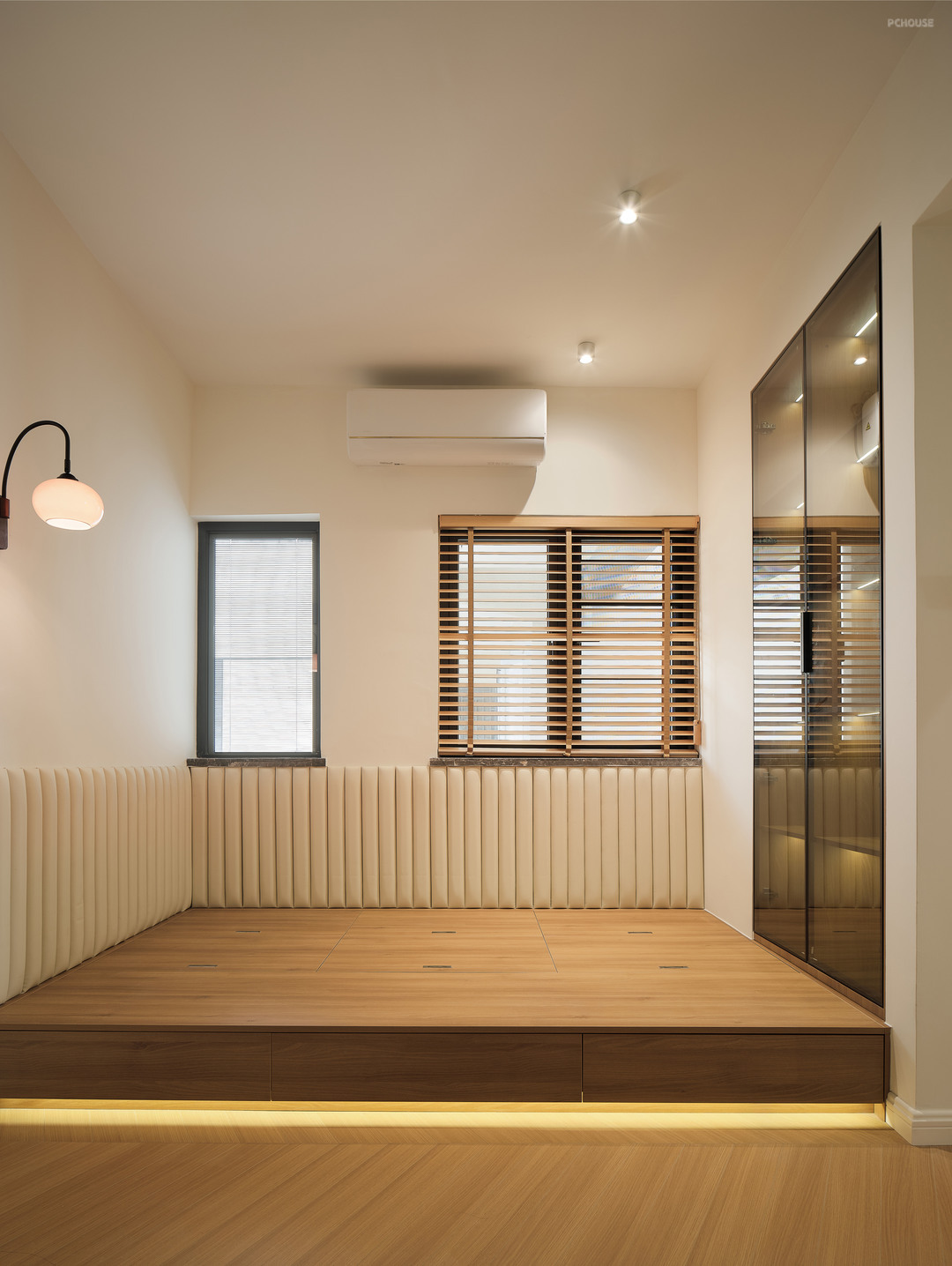 地台床简洁大方,给业主提供最舒适的私人休息空间,床下是抽屉式收纳,用业主的话来说,虽然很简单,但是很实用舒适。