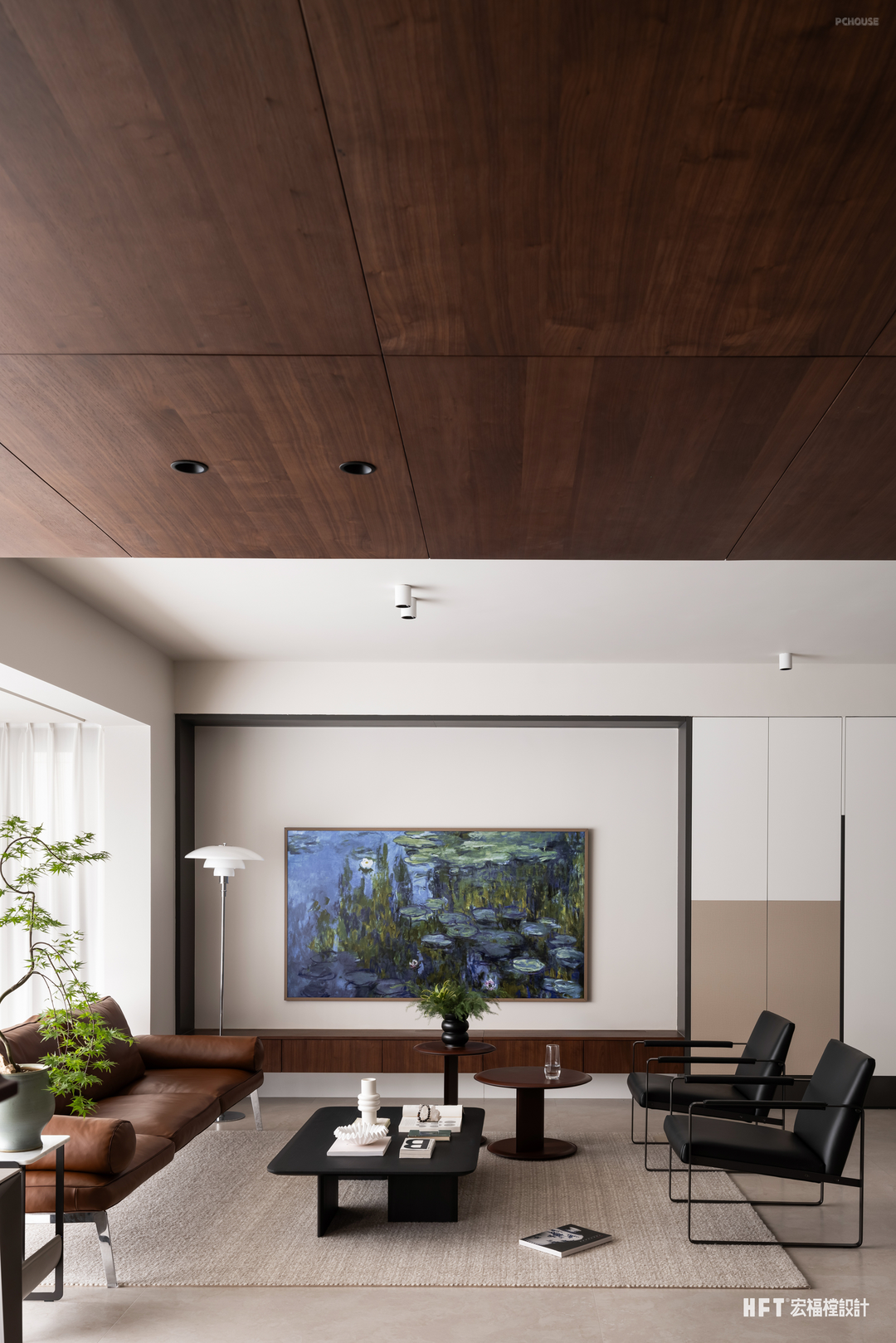 顶部延续胡桃木材进行铺贴,迸发具有强烈识别度的风格张力,构建出全新的叙事形式。
