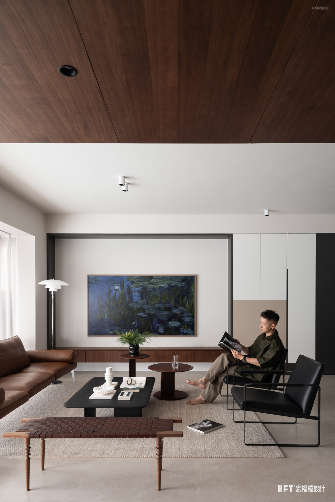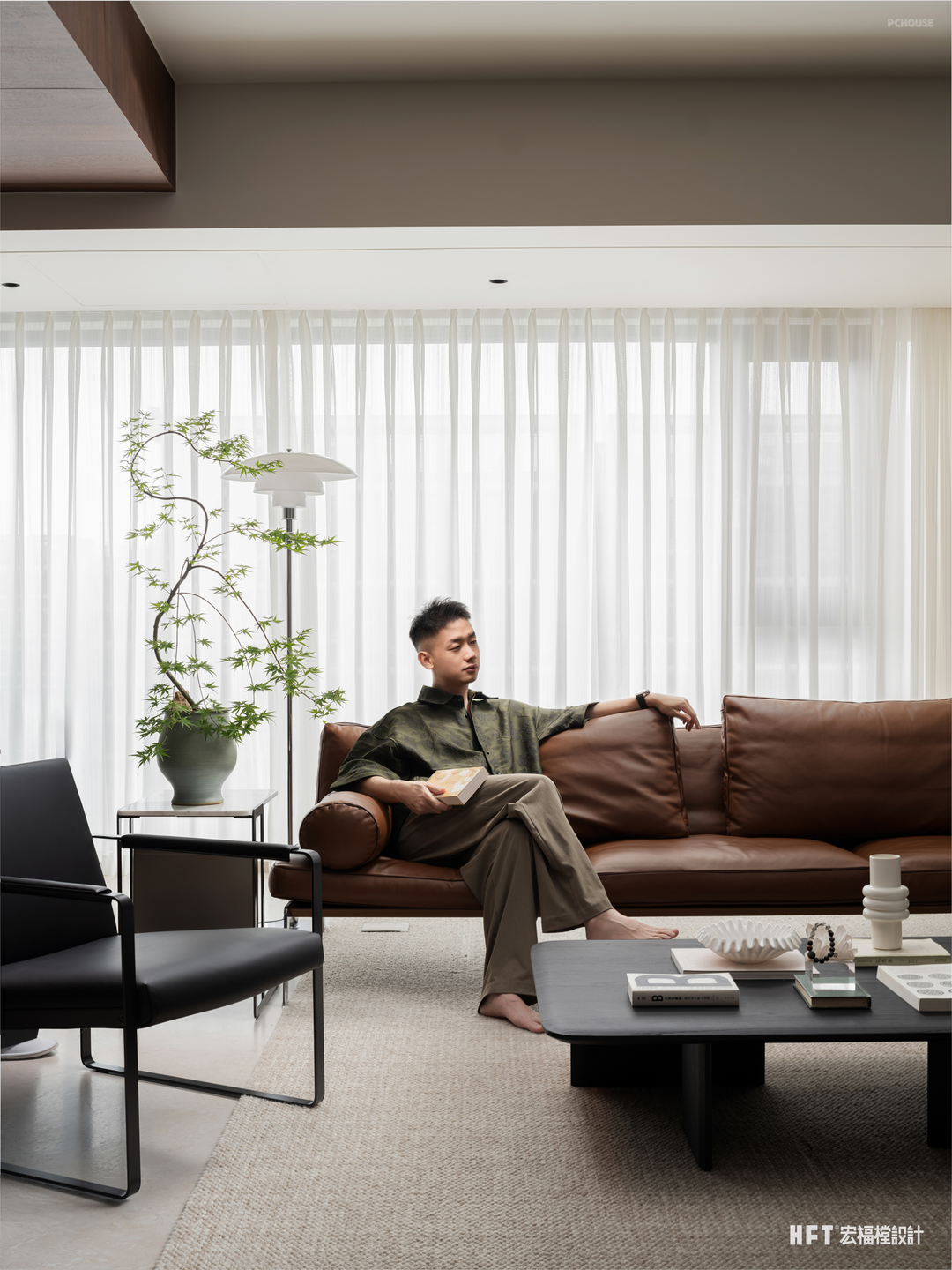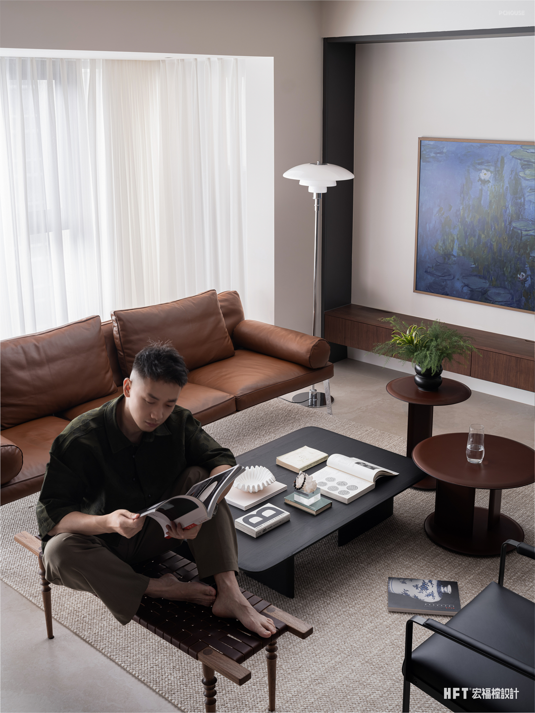 无客厅化设计,多元组合变化的沙发、单椅、边凳、茶几、边几、落地灯充分满足Harry邀请朋友做客时的场景所需。