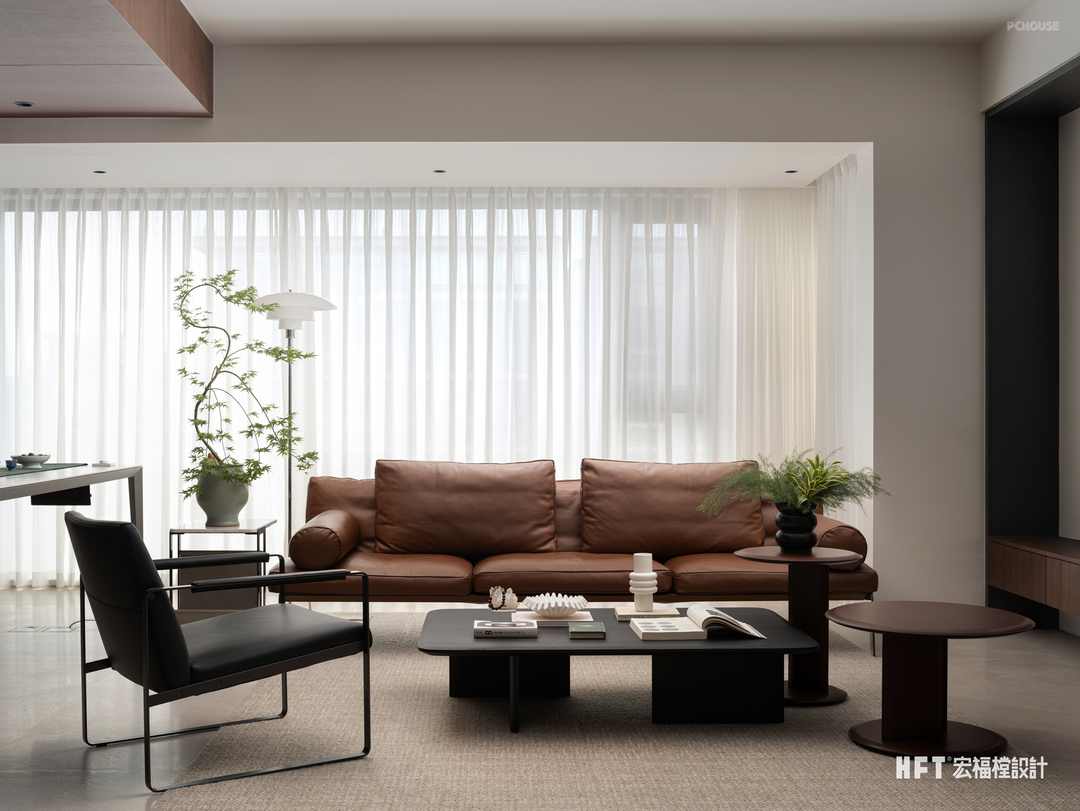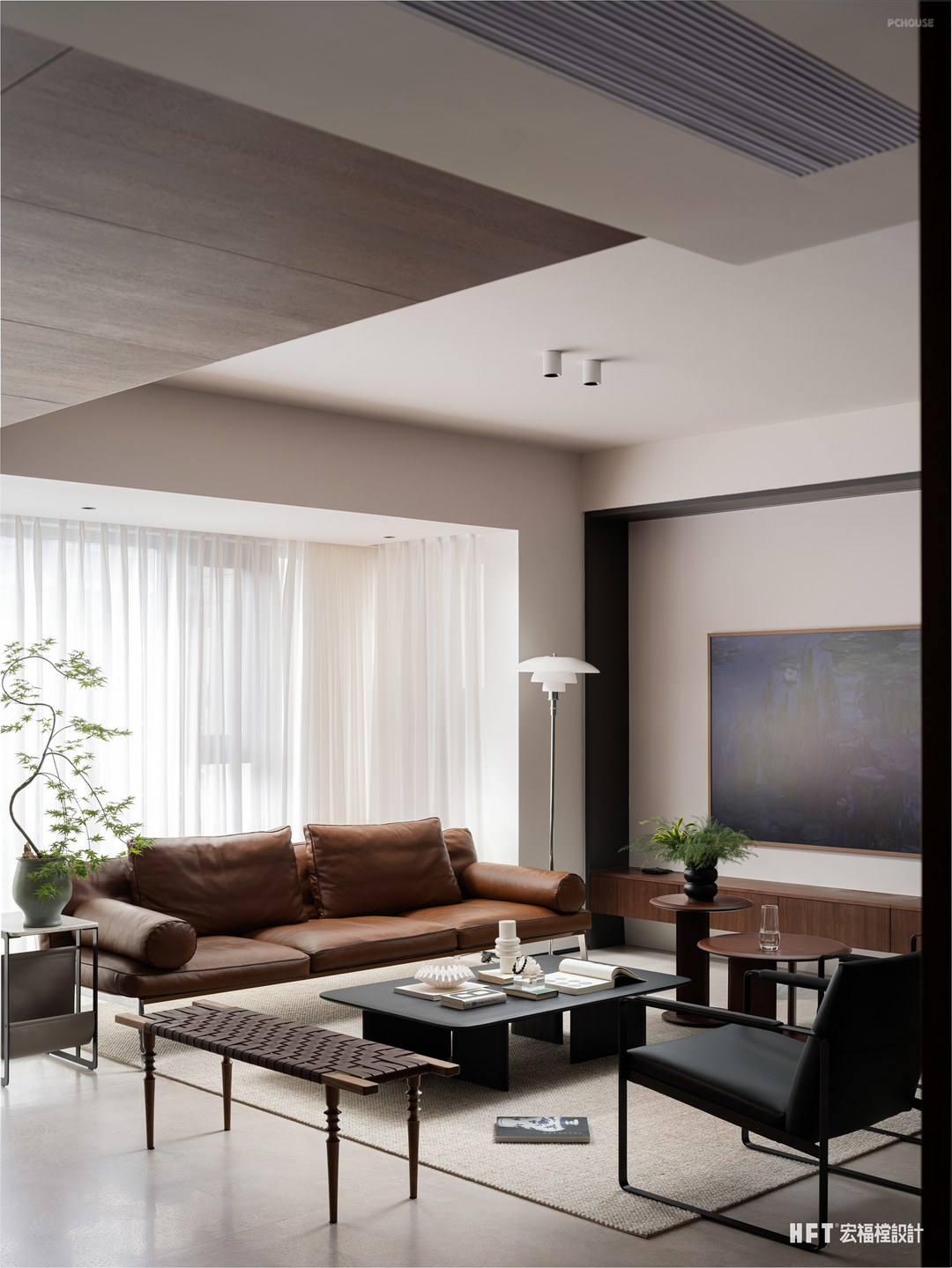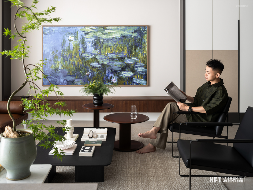 无客厅化设计,多元组合变化的沙发、单椅、边凳、茶几、边几、落地灯充分满足Harry邀请朋友做客时的场景所需。