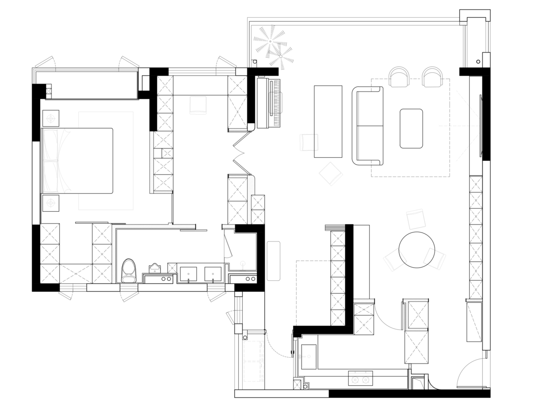 该案是为一对恋人原125㎡空间切割得狭小雾碎,爱好颇多:钢琴、书法、茶艺、烹饪,日常喜欢邀请朋友于家中聚会,由此集中在公区改善。融合人少时就餐(圆桌形式),多数人就餐(长桌形式),以及观影待客空间,再加上可偶尔留客过夜的多功能区域。针对主卧结合了衣帽间以及书房的功能区域。