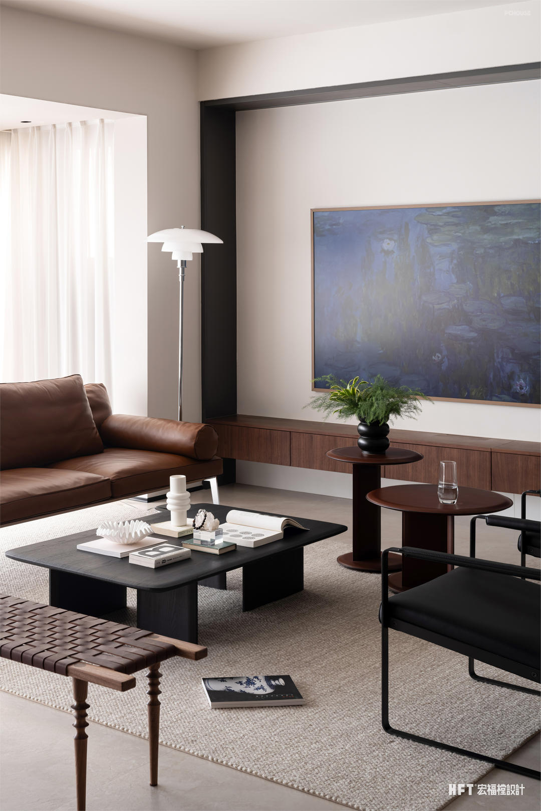 客厅中轴布局,近景、中景、远景运镜上的包豪斯风格陈设皆成为焦点,而那些随机的不对称物件成为点缀生活场景的小巧思,呈现出既有立体层次,又自由有序的居住感受。