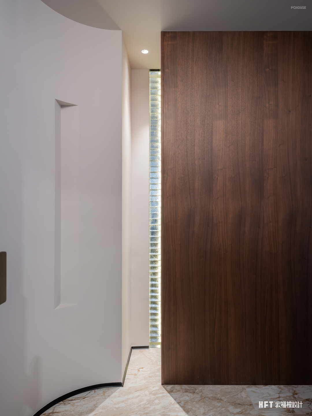 原始玄关较为封闭局促,将厨房整体后移,左侧柔和的弧形造型将拆除墙体后裸露出的烟道区域进行包裹。立面与储物柜体留出部分距离,置嵌玻璃材质实现内外借光,入户玄关收获更宽敞透亮的感官视觉。