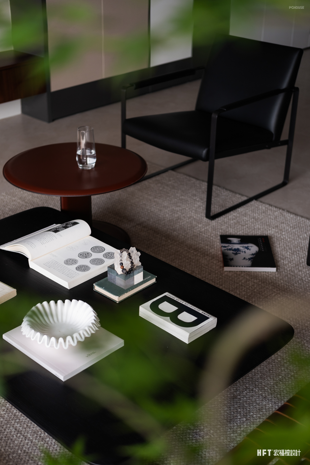 可席于地毯惬意举杯,亦可对望而坐攀谈闲聊。而造型各异的花草绿植,则为空间注入一丝流动轻盈的自然气息。