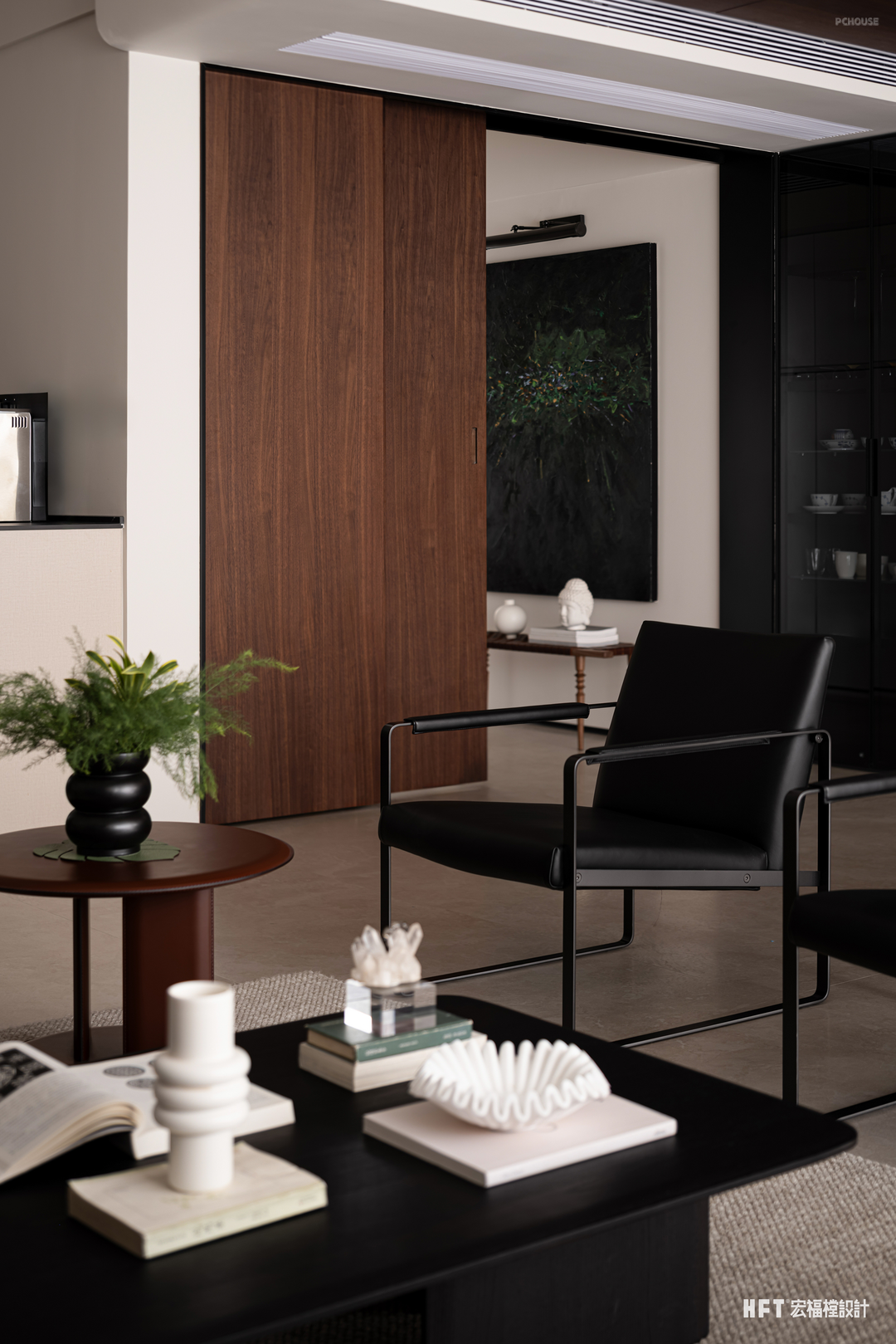 内部为多功能空间,关闭时可作为临时客房使用。开放时与客厅连为一体,扩大公共区域的整体视觉,并局部设计挂画端景,从各个角落增强空间的艺术调性。