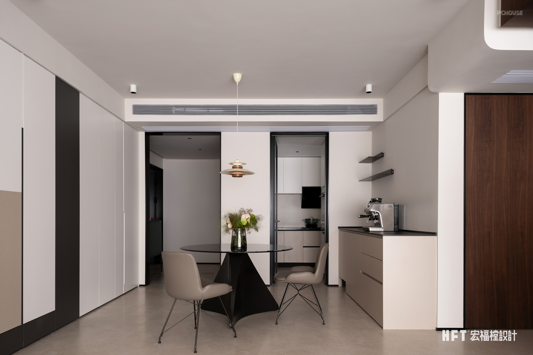 选择具有体量感以及造型别致的圆桌,摆放于餐厅中心,功能与艺术美感同时兼备。一侧设计西厨补充日常餐具、咖啡机储放,多元居家生活方式。