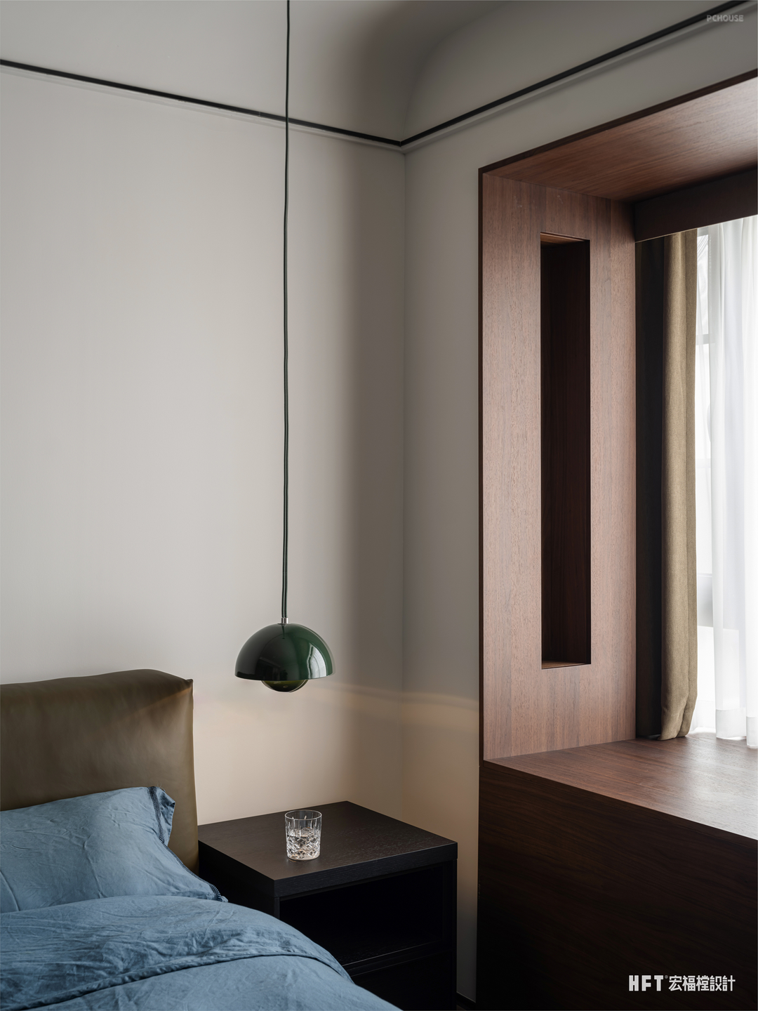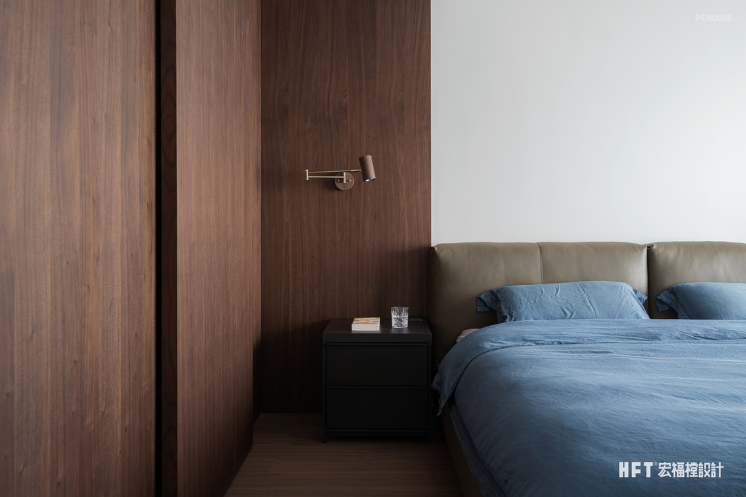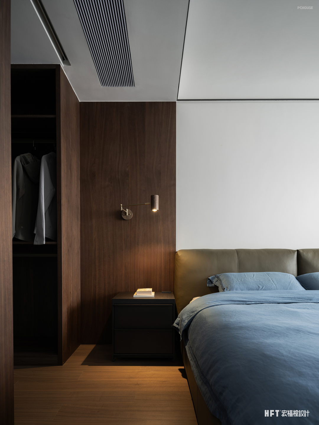 延续胡桃木材作为卧室氛围主调,空间在推拉门开合之间呈现不同的视觉状态。