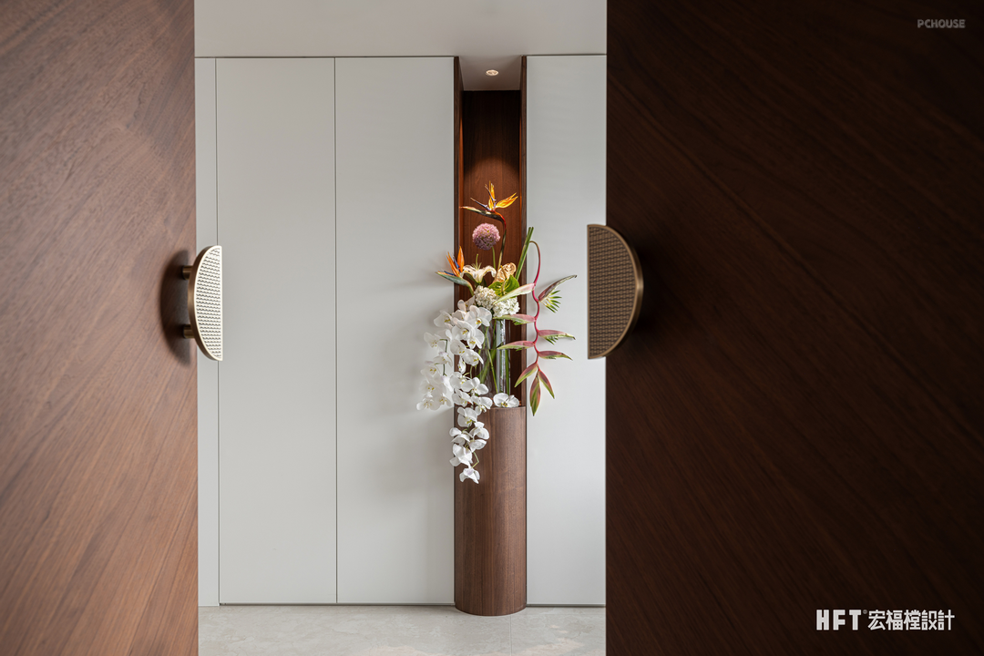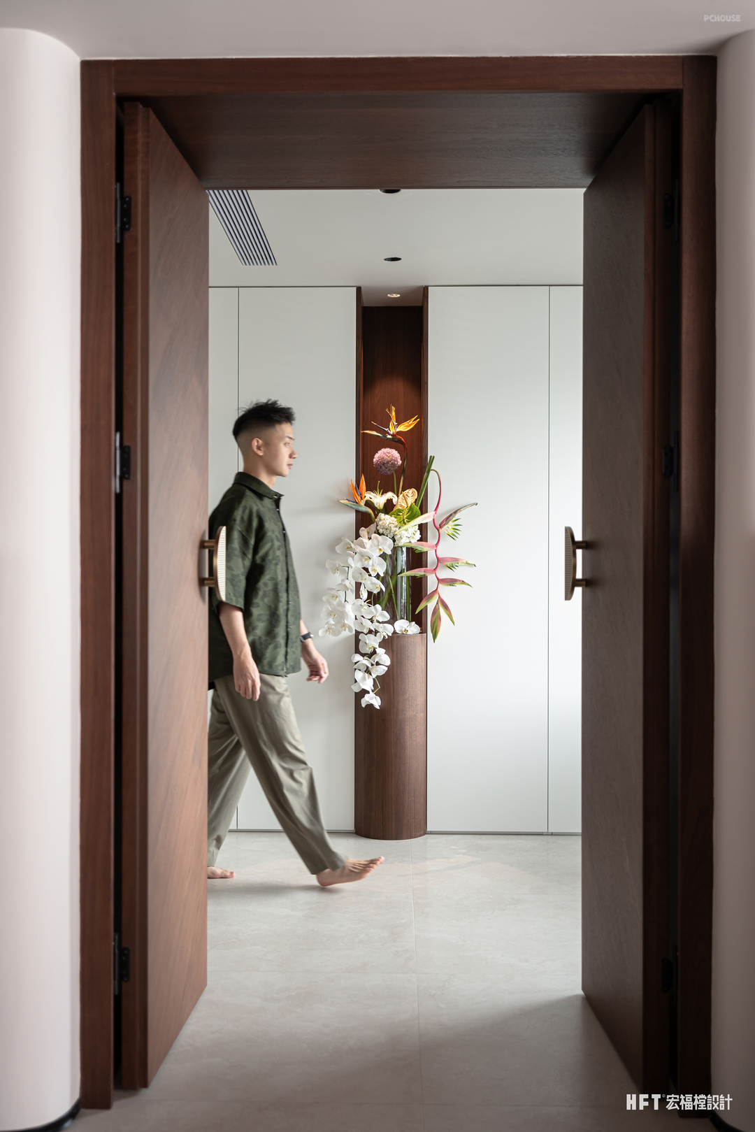 同样以中轴布局,中心位置设计仪式感较强的胡桃木双开门,将对称印象进行强化。