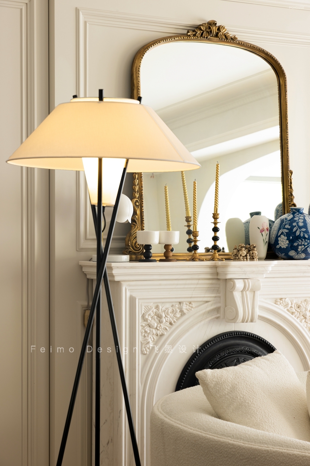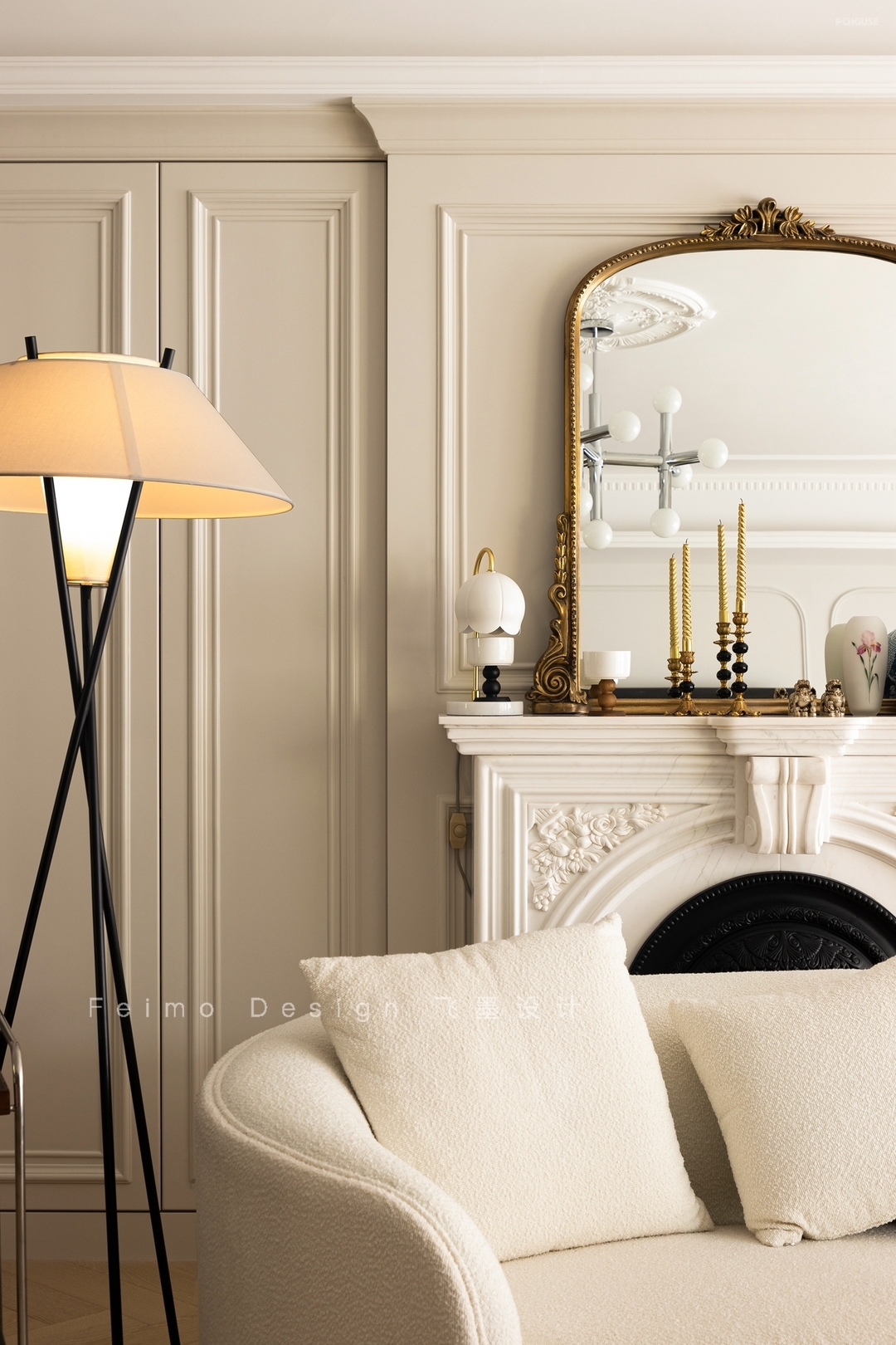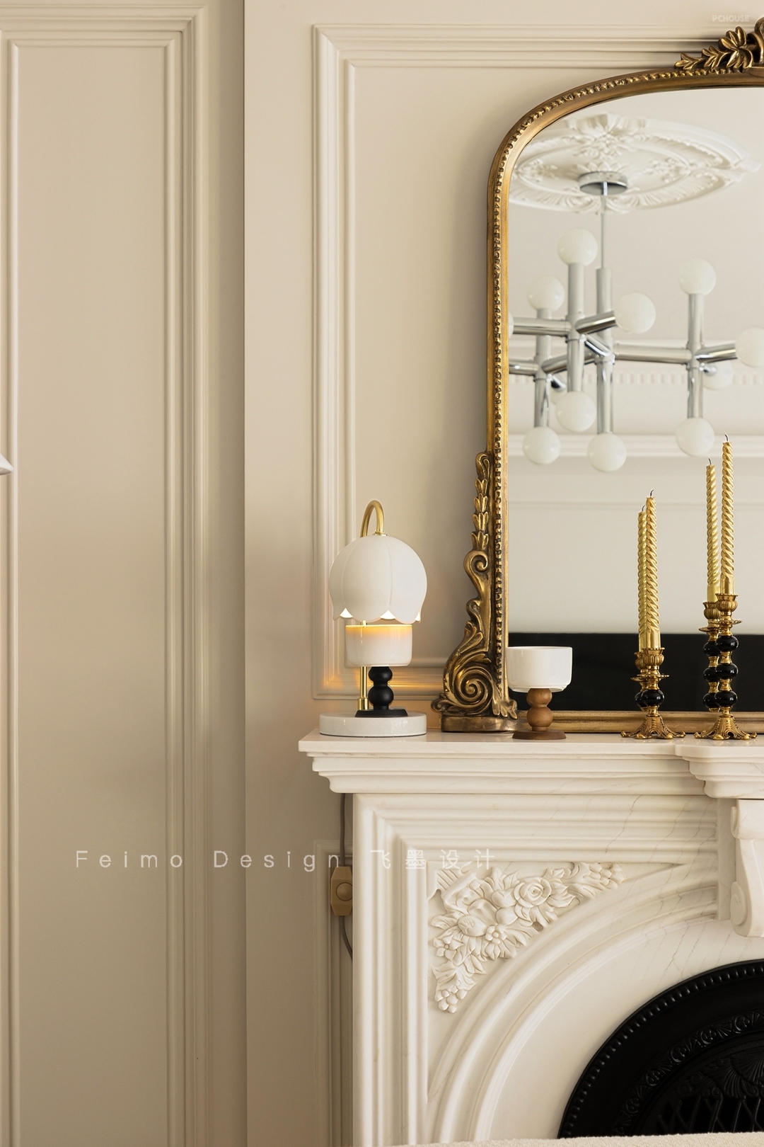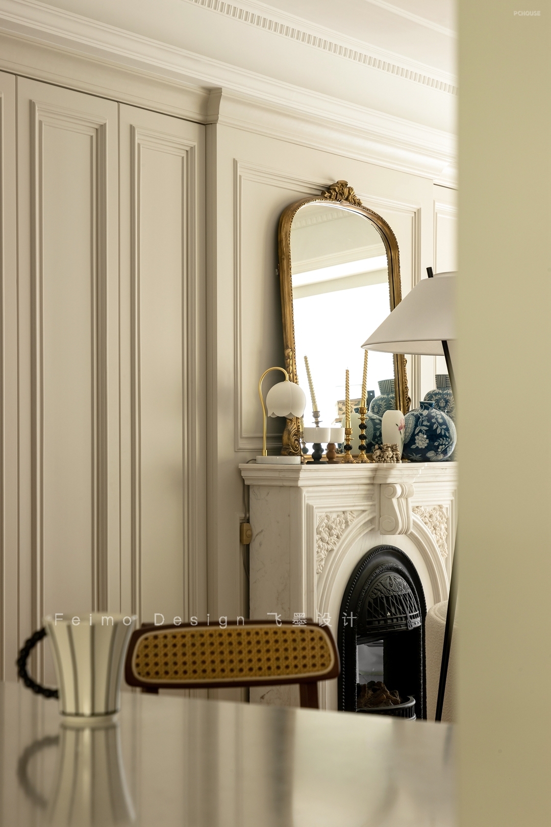 沙发墙的壁炉与黄铜镜子,复古陈设定下法式基调;为了设计整体性,柜体嵌入非承重墙内部,并依据墙面的设计定制造型。