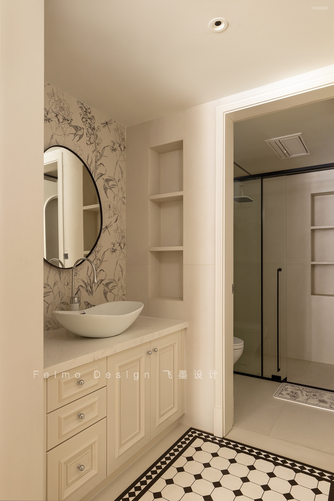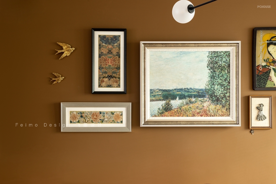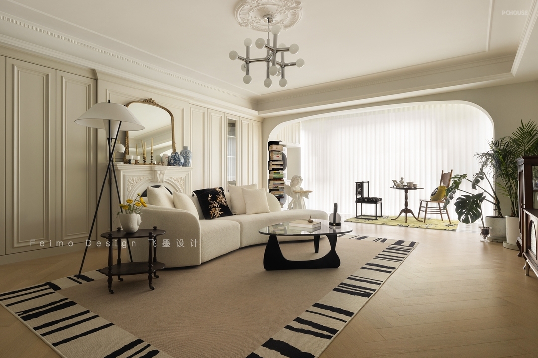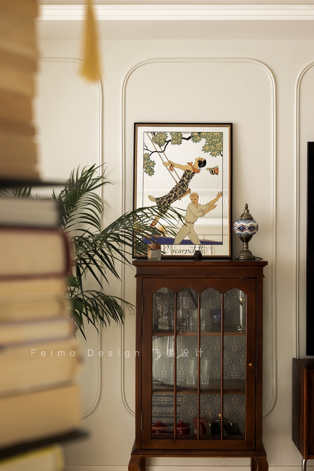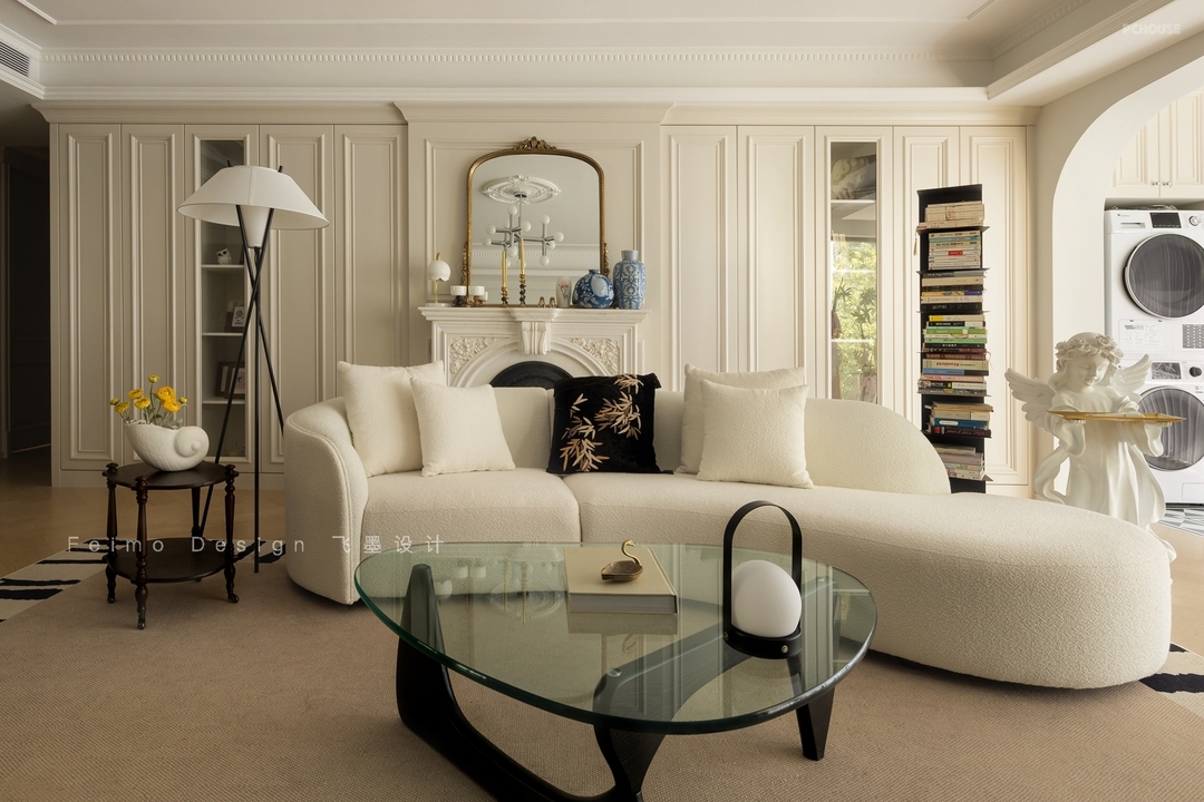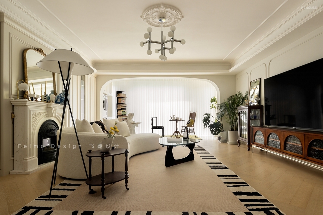 沙发墙的壁炉与黄铜镜子,复古陈设定下法式基调;为了设计整体性,柜体嵌入非承重墙内部,并依据墙面的设计定制造型。